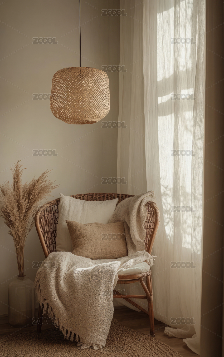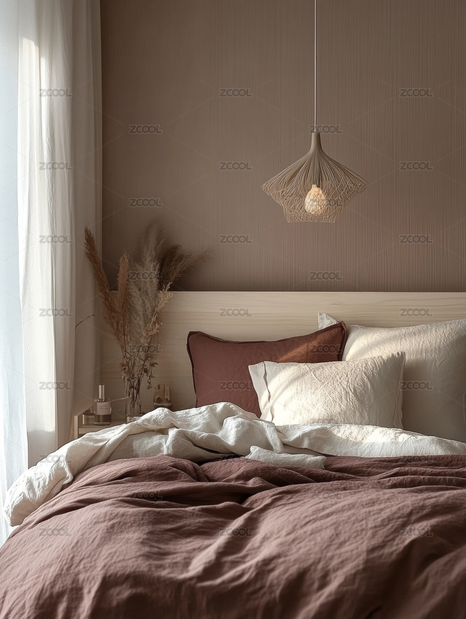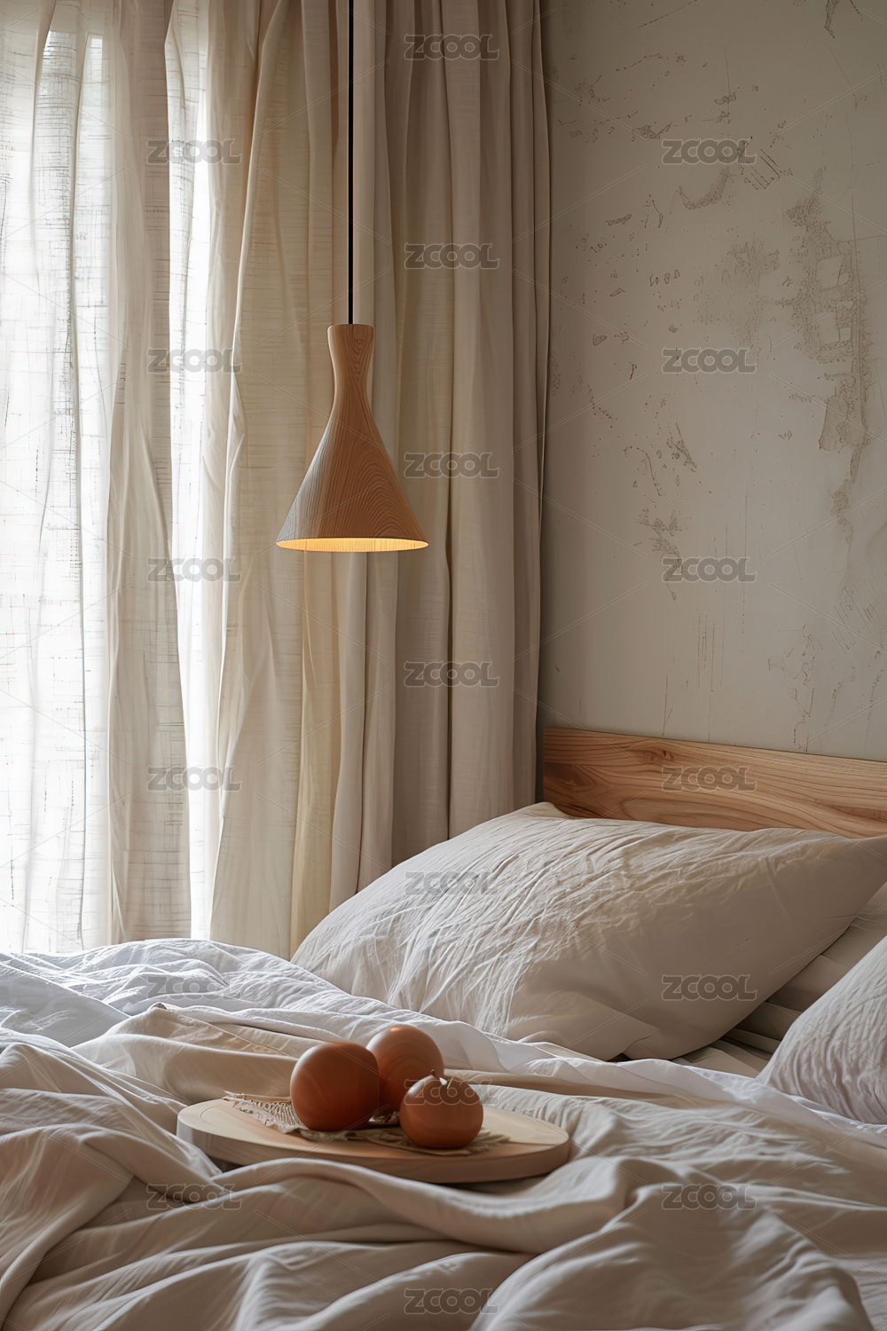 极简卧室阳光透过窗帘洒在床上