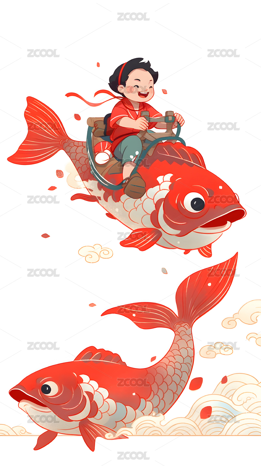 AIGCFG,中国风,插画,中式风格,国潮风,卡通,金鱼,锦鲤,孩子,儿童