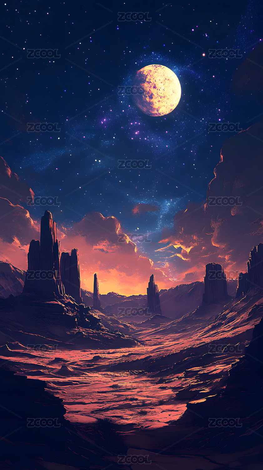 奇幻星球夜空下的红色峡谷