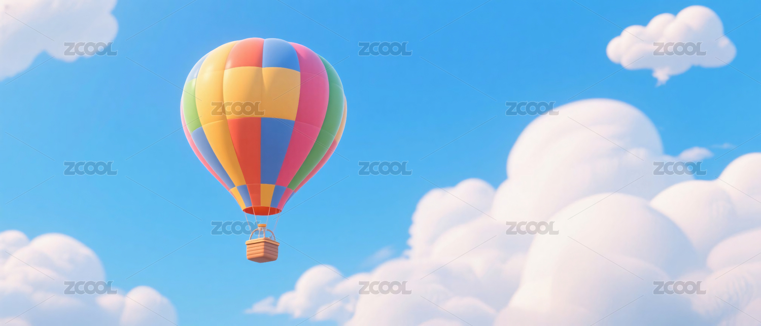 一个热气球在蓝天白云中飞翔的场景