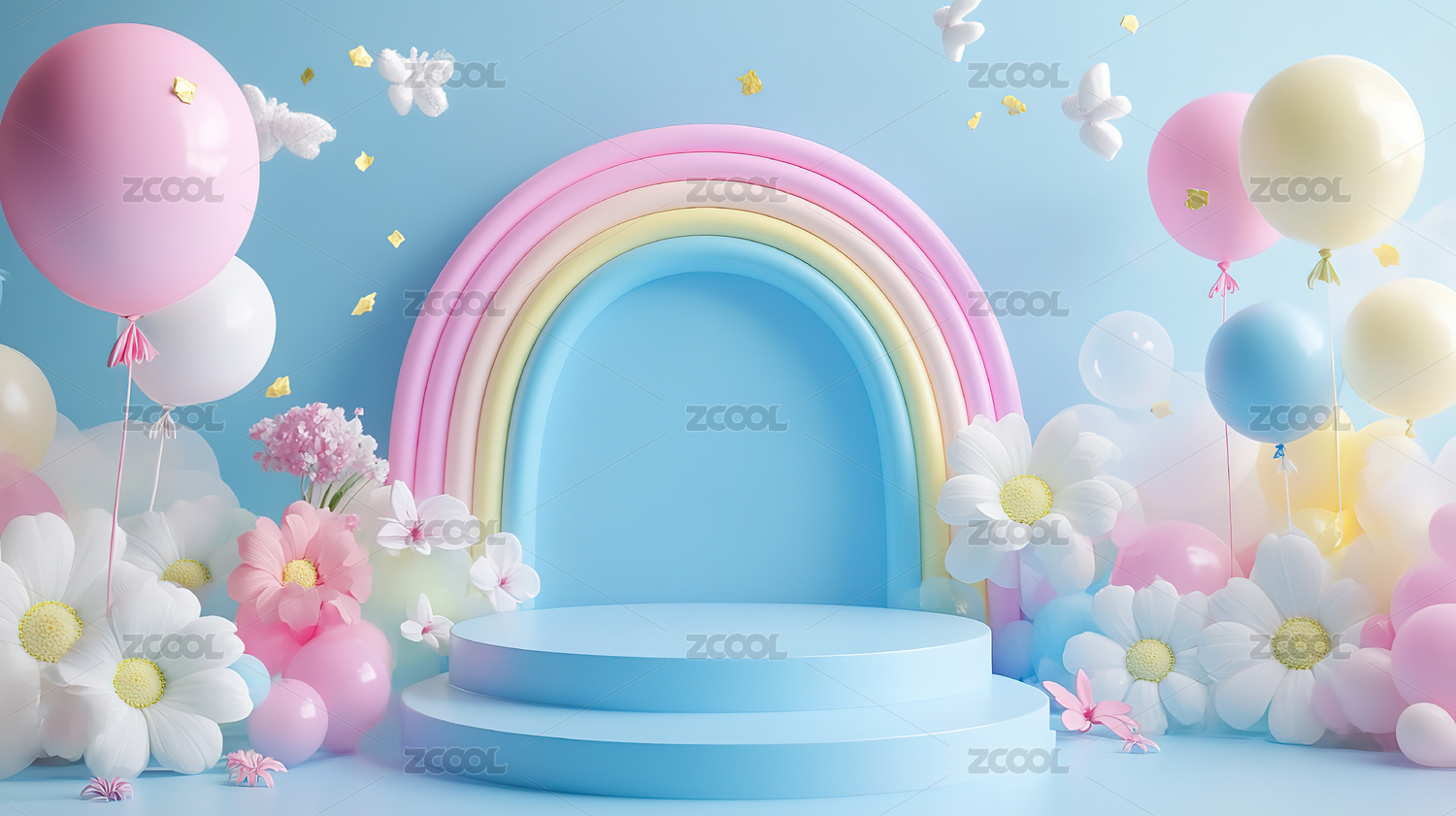 3D卡通花朵彩虹展台电商背景