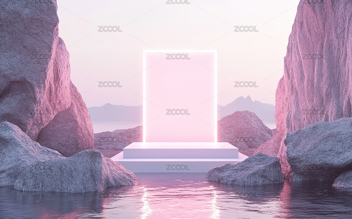 霓虹方框映照海面的日落景象