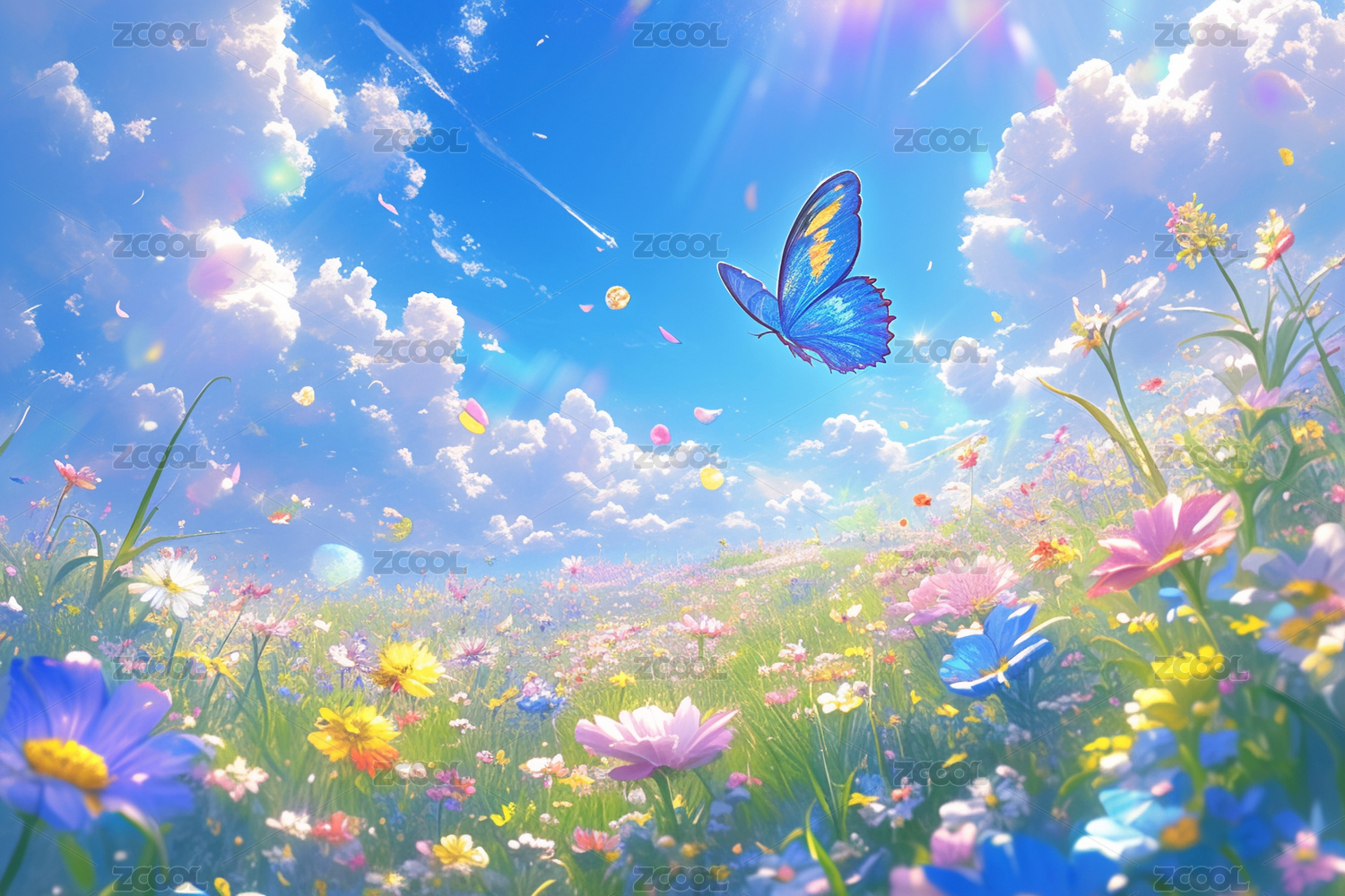 蓝天白云下的彩虹和飞舞的蝴蝶