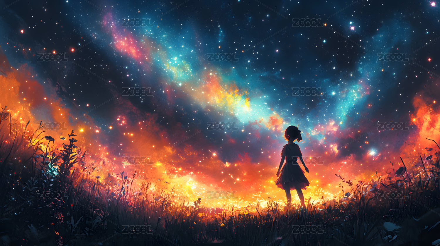 树下少女星空下的梦幻场景