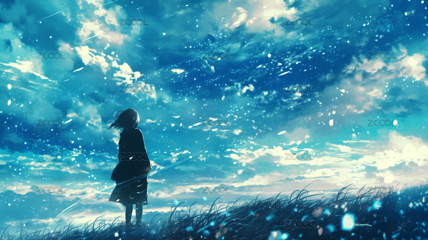 唯美蓝天下的女孩背影插画