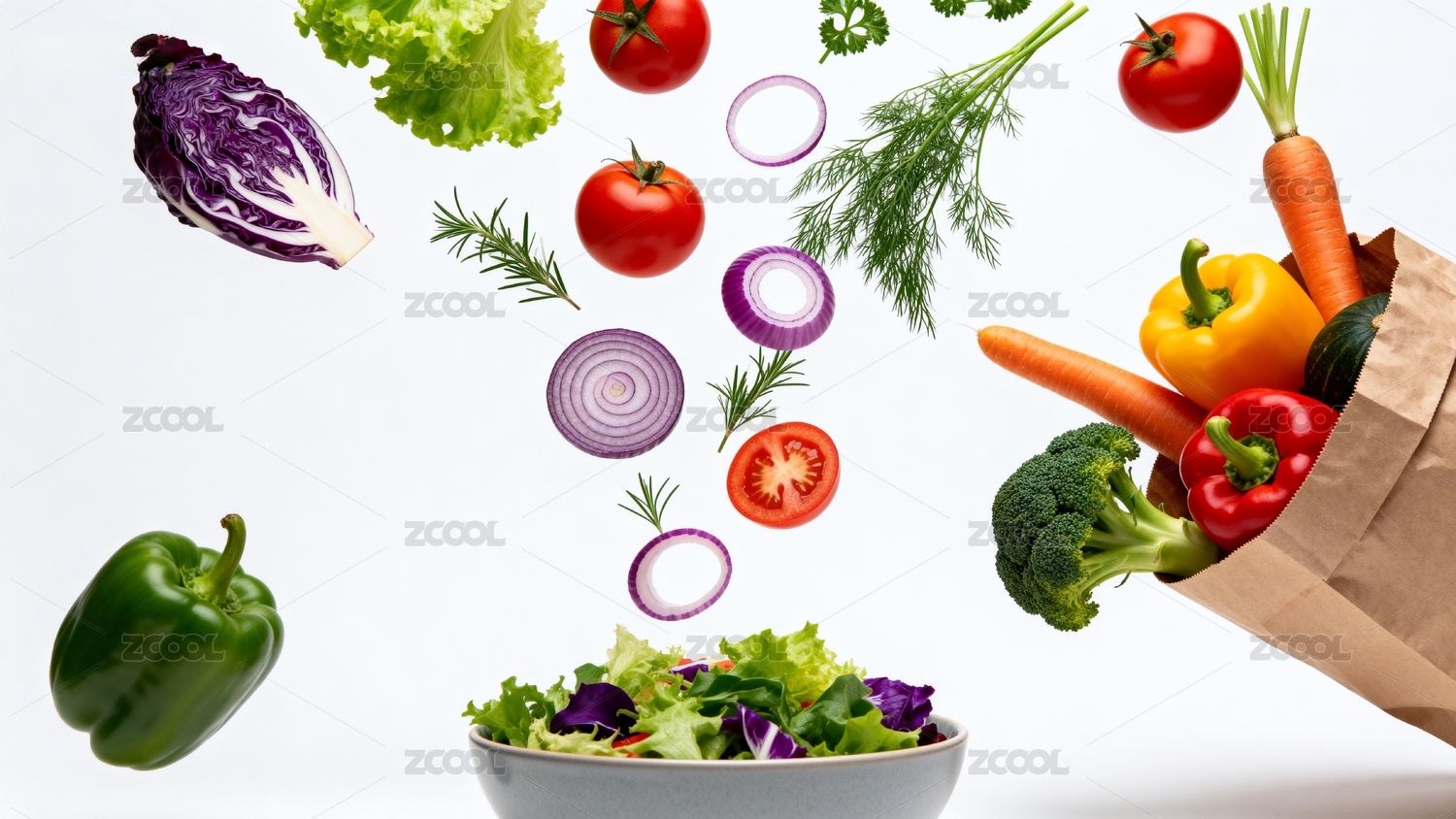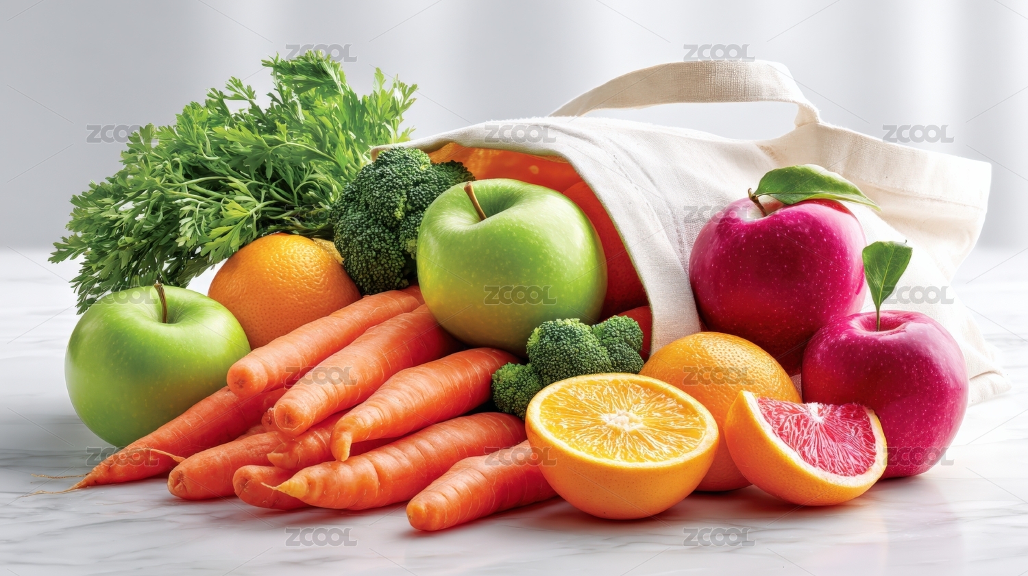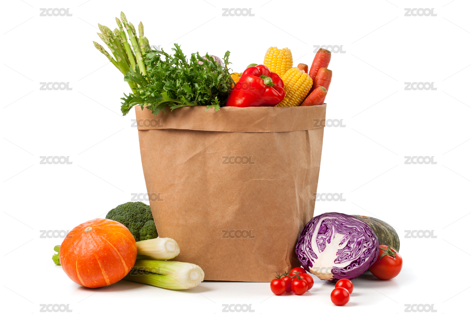 白色背景里摆放着各种各样新鲜的水果蔬菜