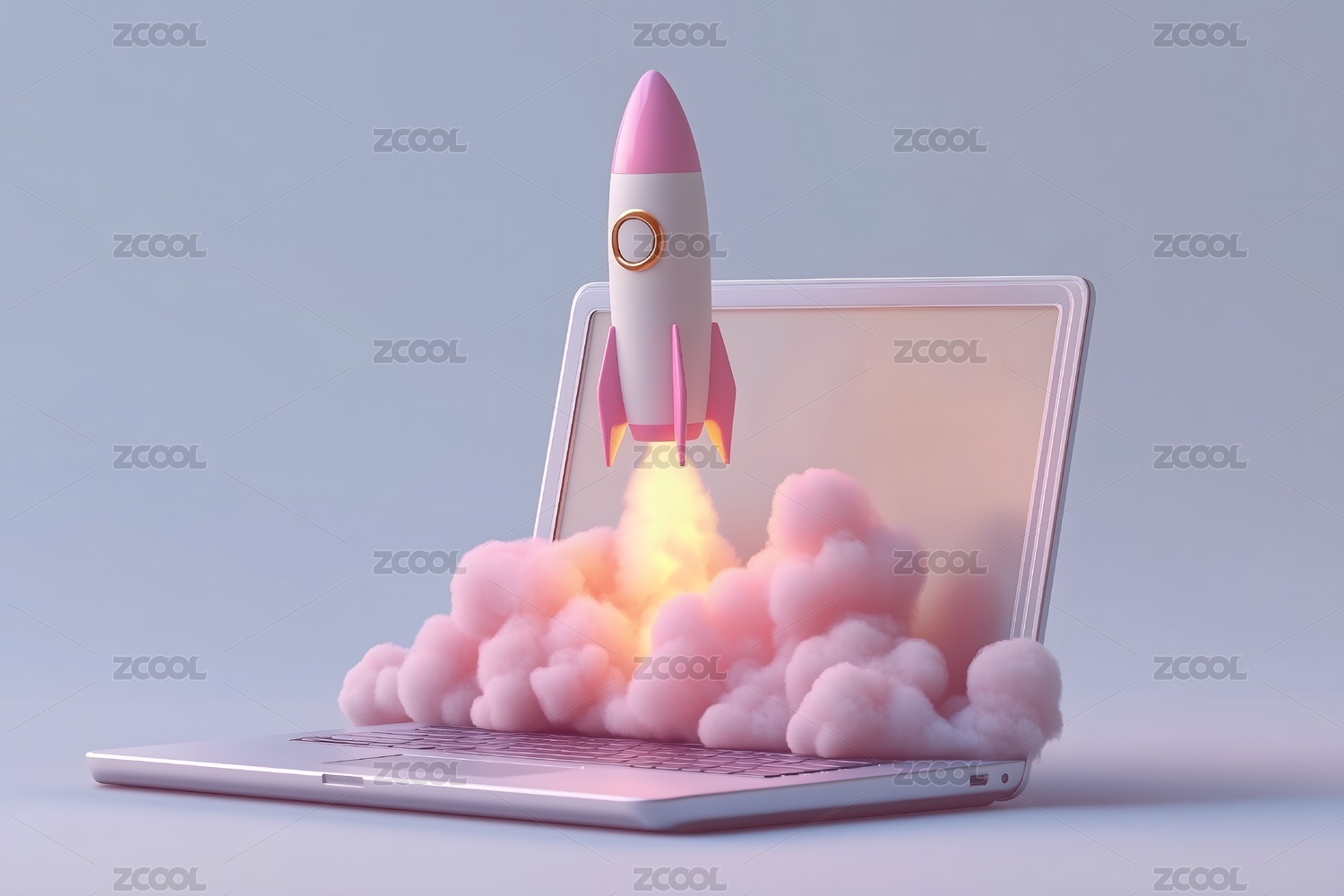 粉色背景下火箭从电脑中起飞