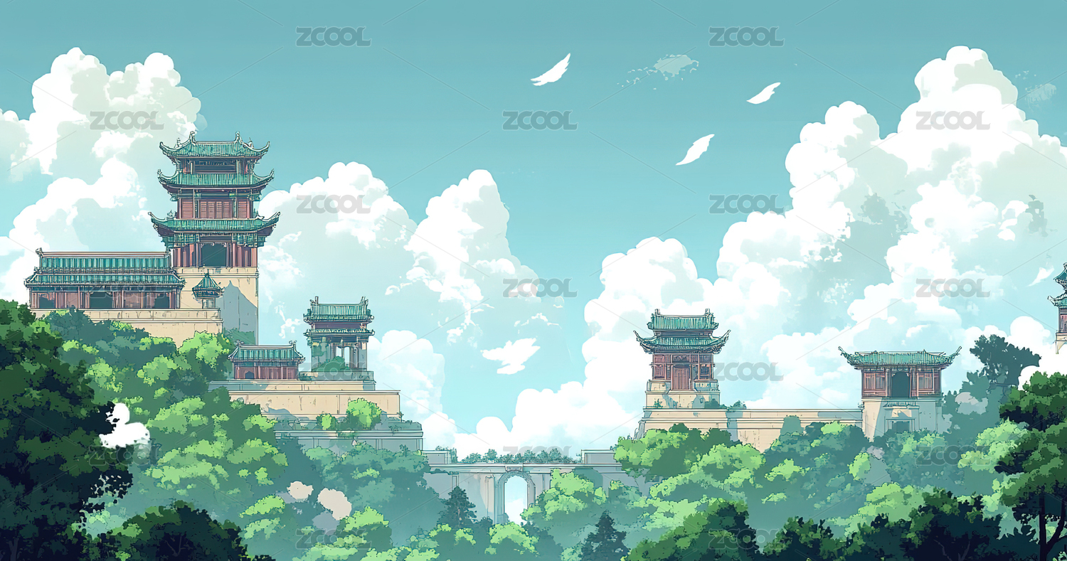 中国风古楼建筑传统国风古建筑国潮插画背景