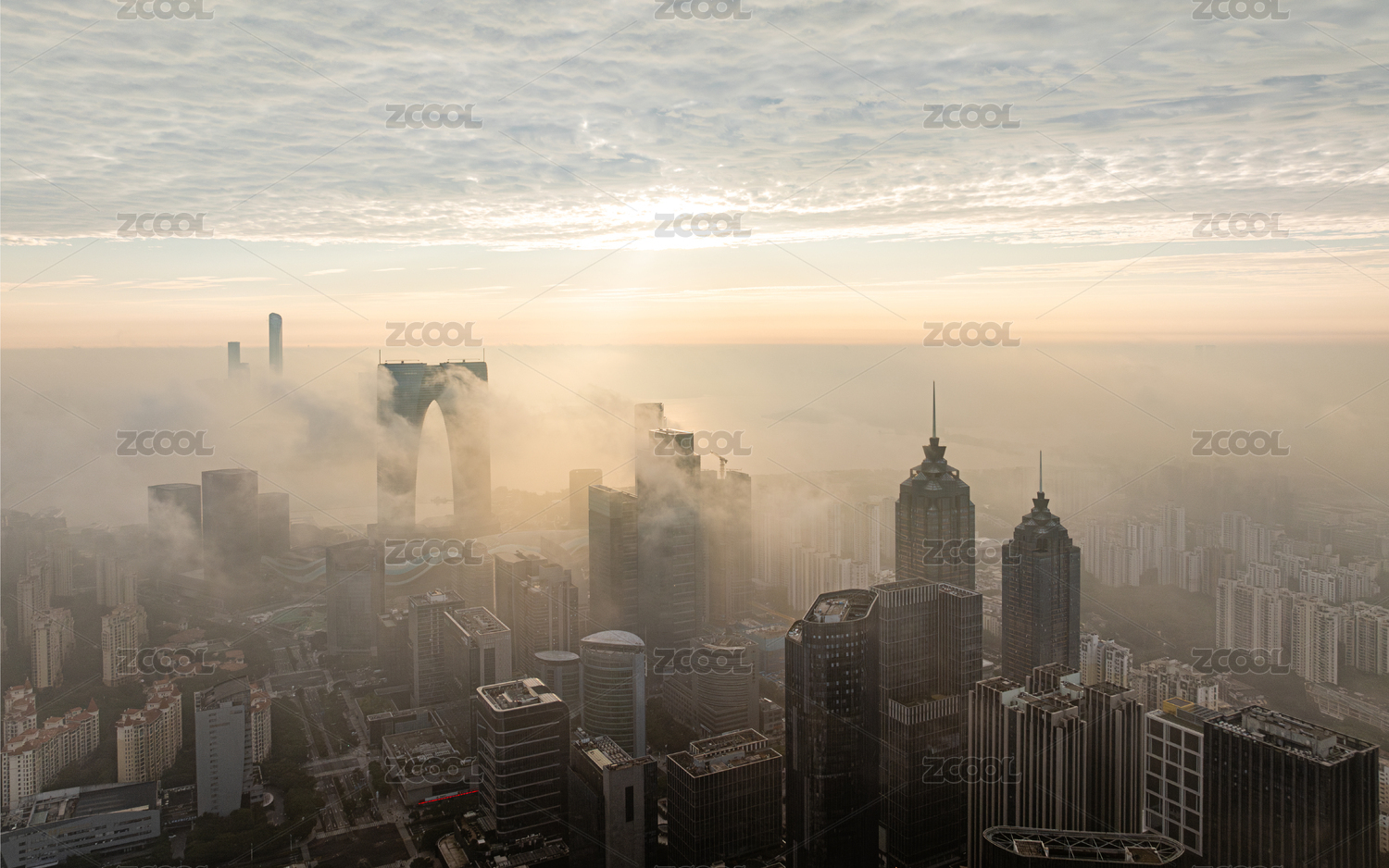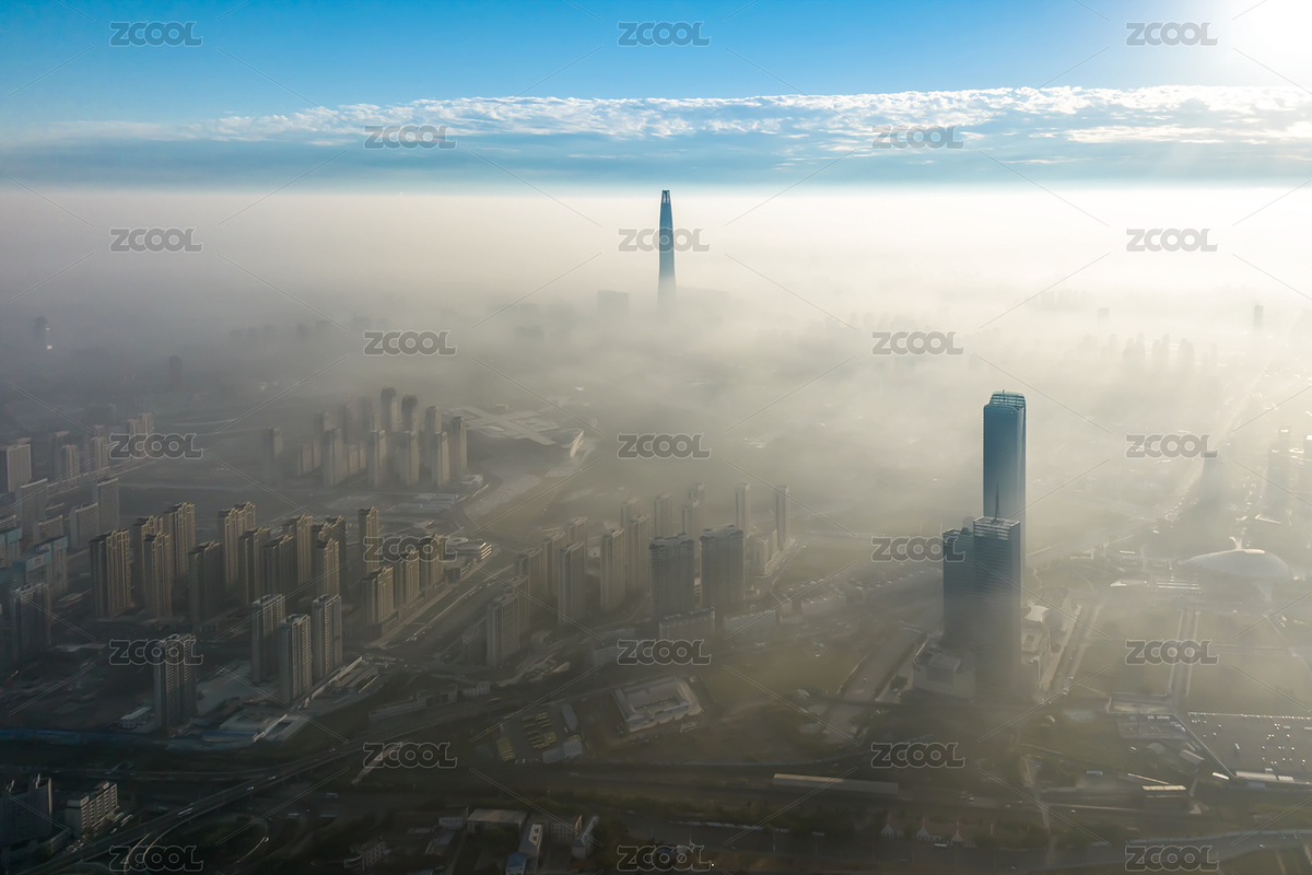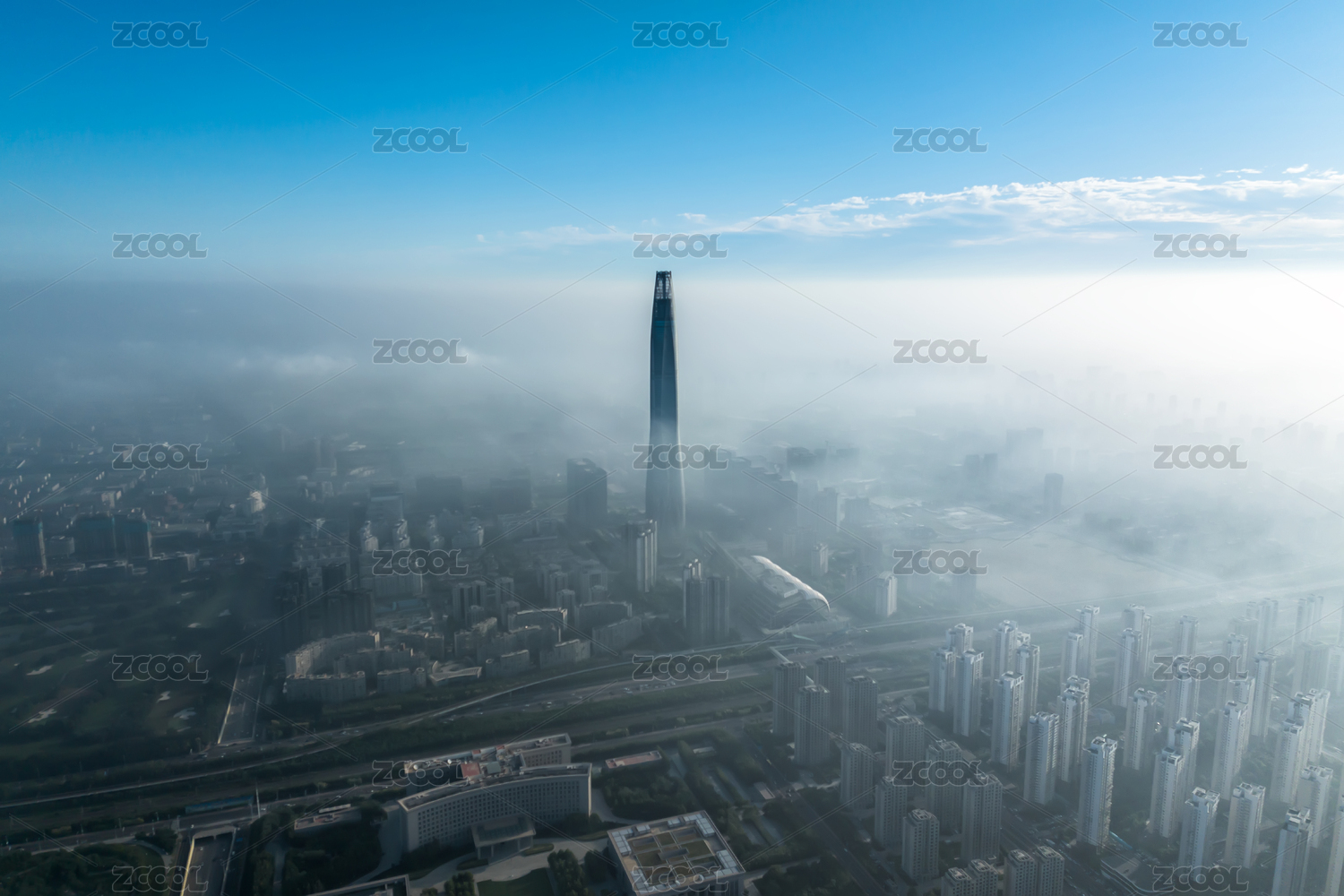 天津滨海新区,城市,都市风光,城市天际线,平流雾,晨雾,清晨,于家堡金融区,摩天大楼