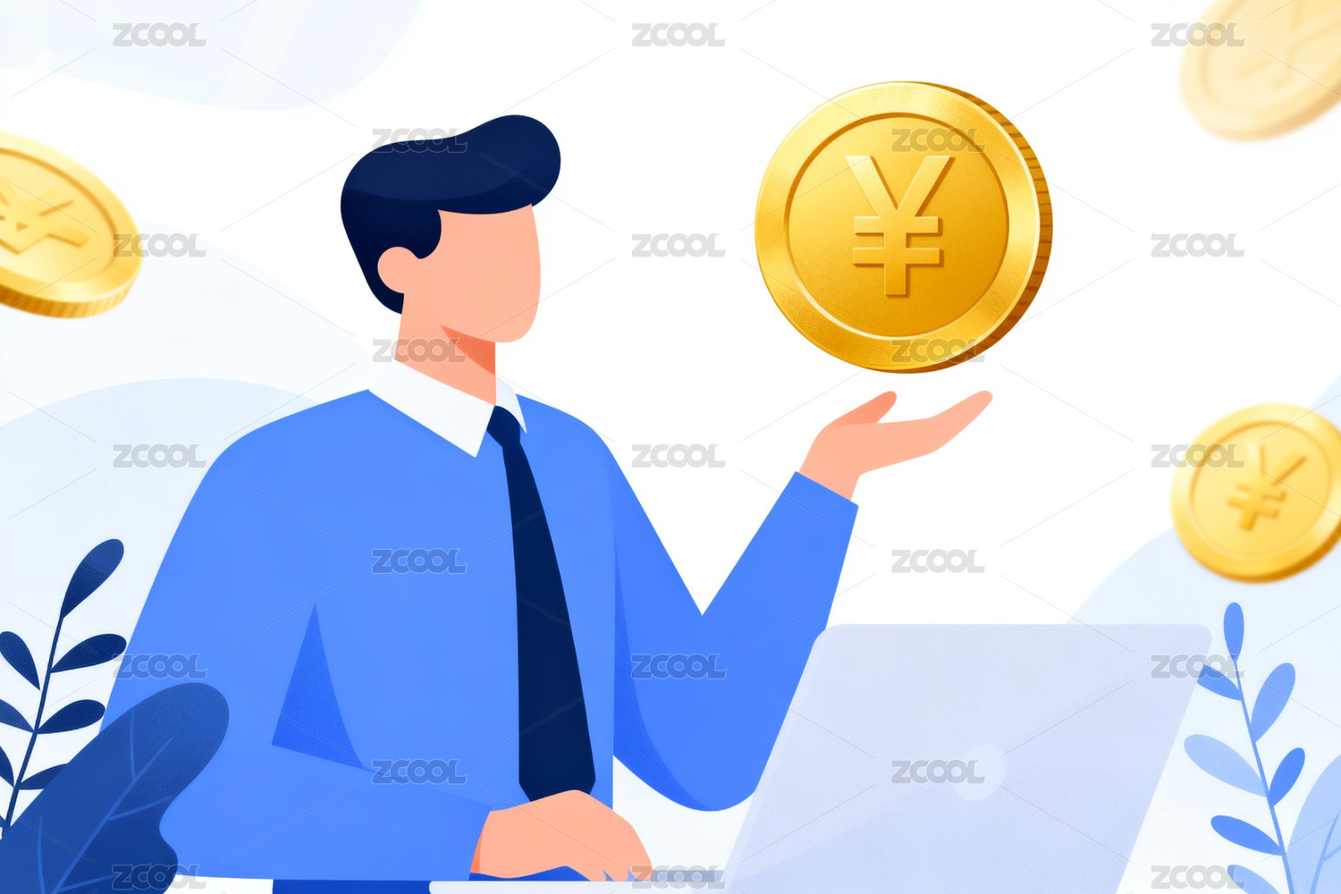 卡通手绘男人手持金币财富赚钱网络经济上涨插画