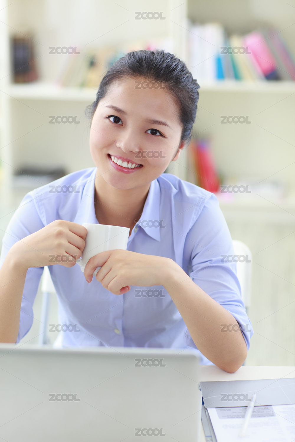 年轻的亚洲女子与笔记本电脑室内工作