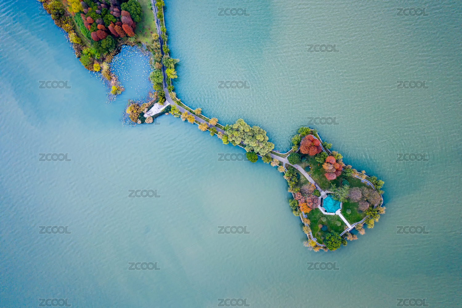 中国江苏省苏州市金鸡湖湖心亭航拍风光