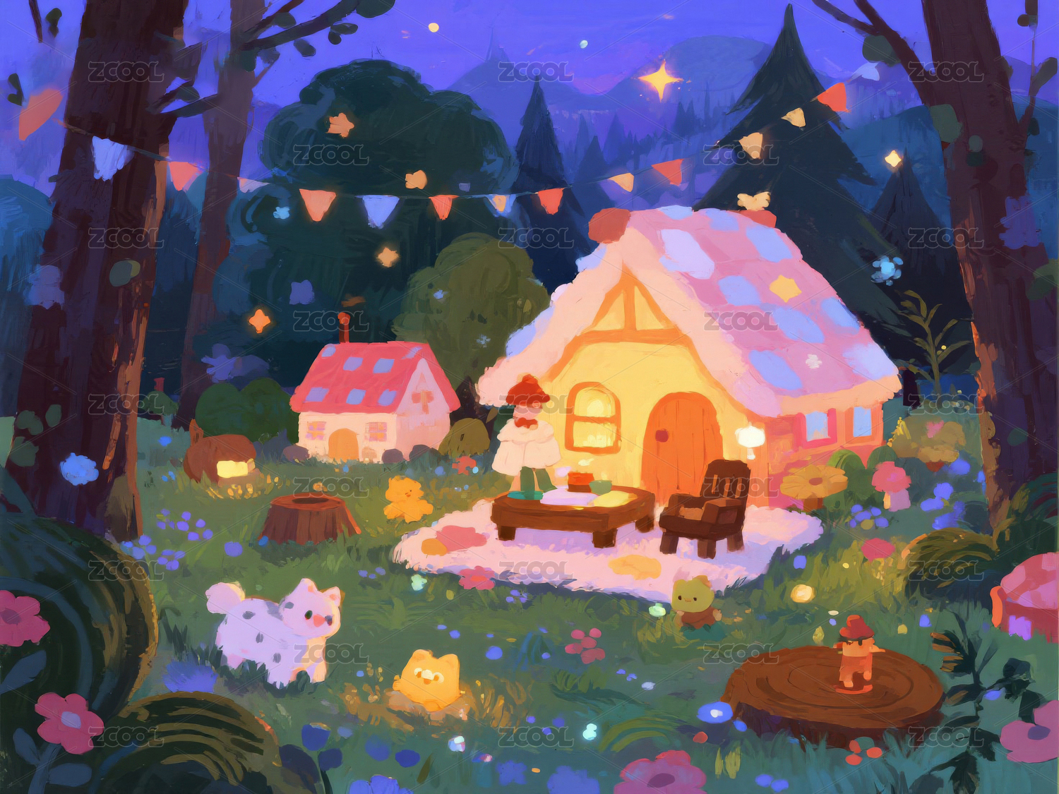 户外夜晚露营假期冒险森林徒步夏令营插画