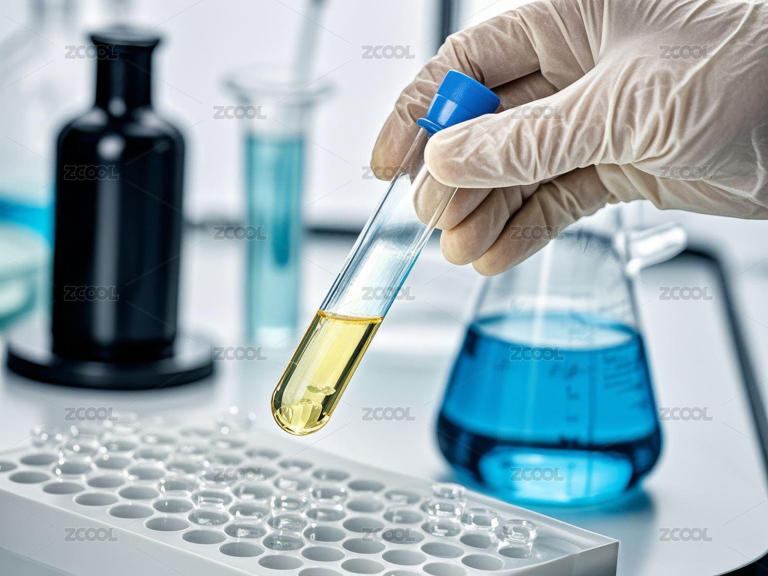 科学家手持蓝色试剂瓶