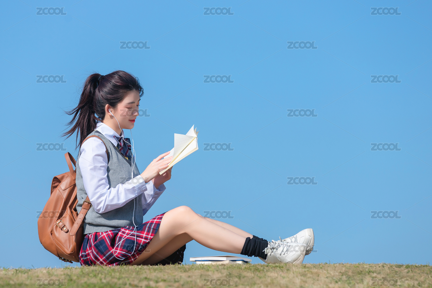 蓝色天空背景下,坐在草地上的亚洲女学生