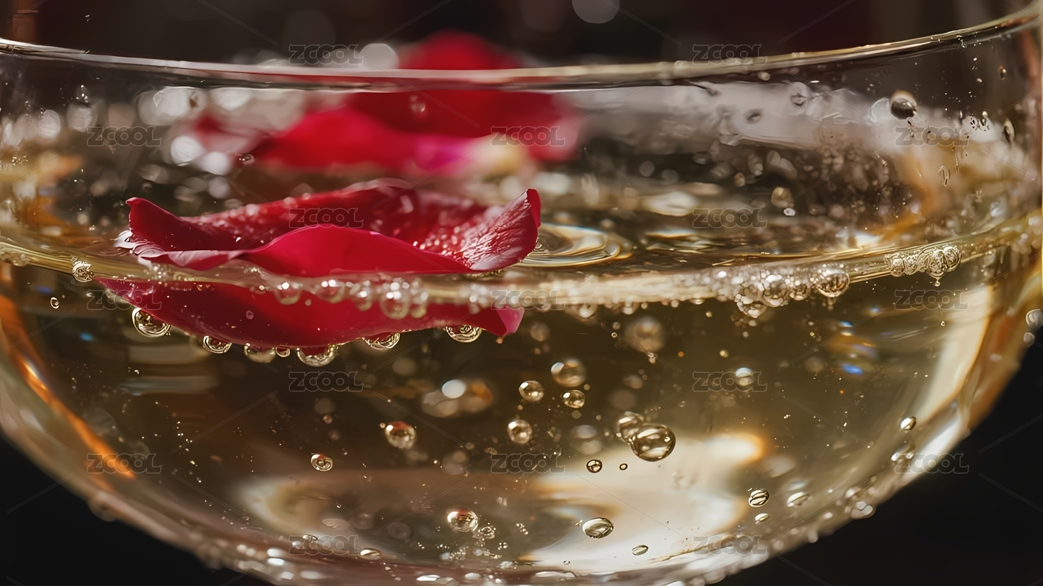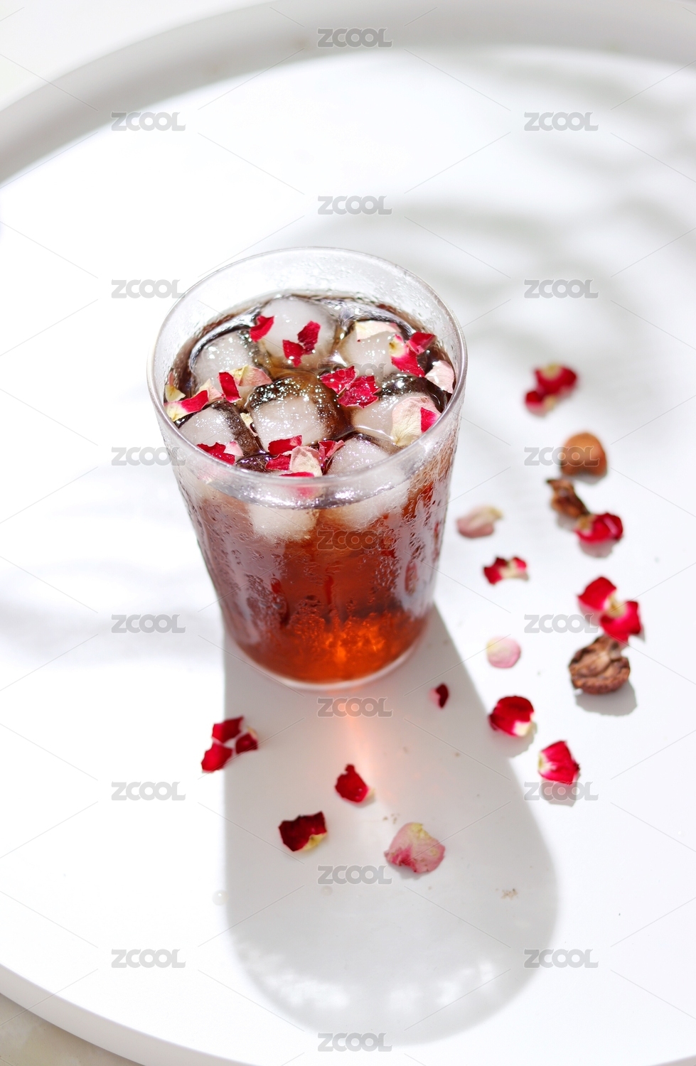 玻璃茶盏中的玫瑰花茶,旁边放着玫瑰花