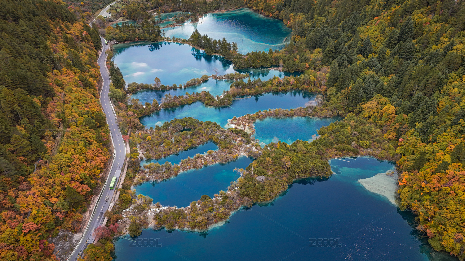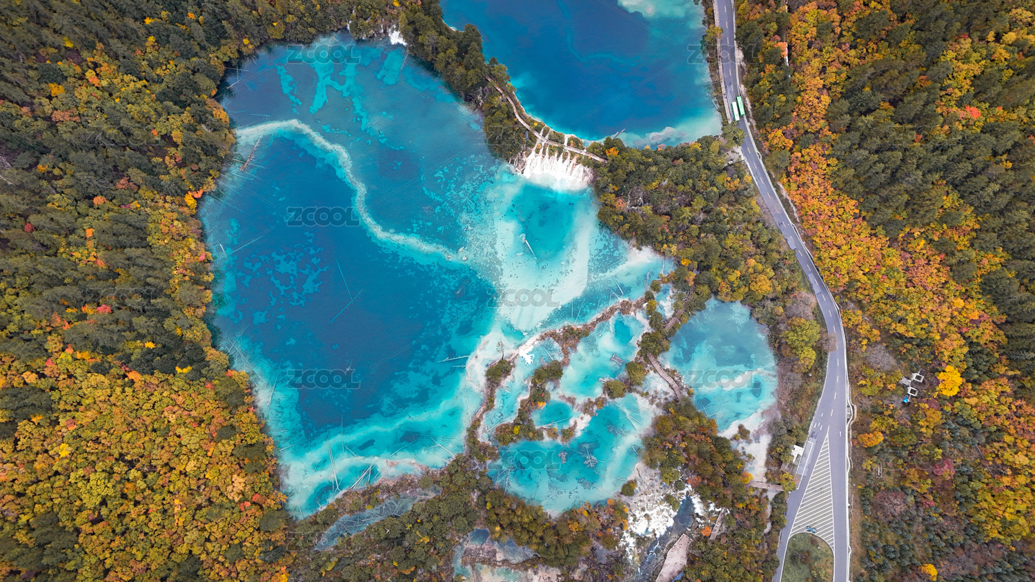 九寨沟秋景中的斑斓湖泊与蜿蜒公路