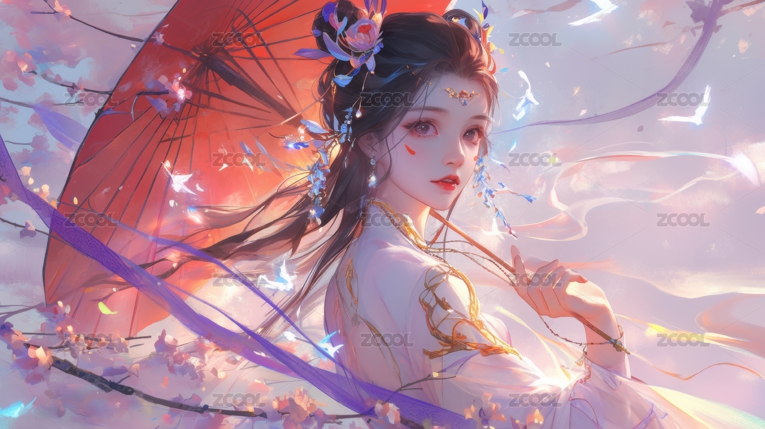插画,蓝色,艺术,唯美,少女,绘画,花瓣,红伞,飘落,红色