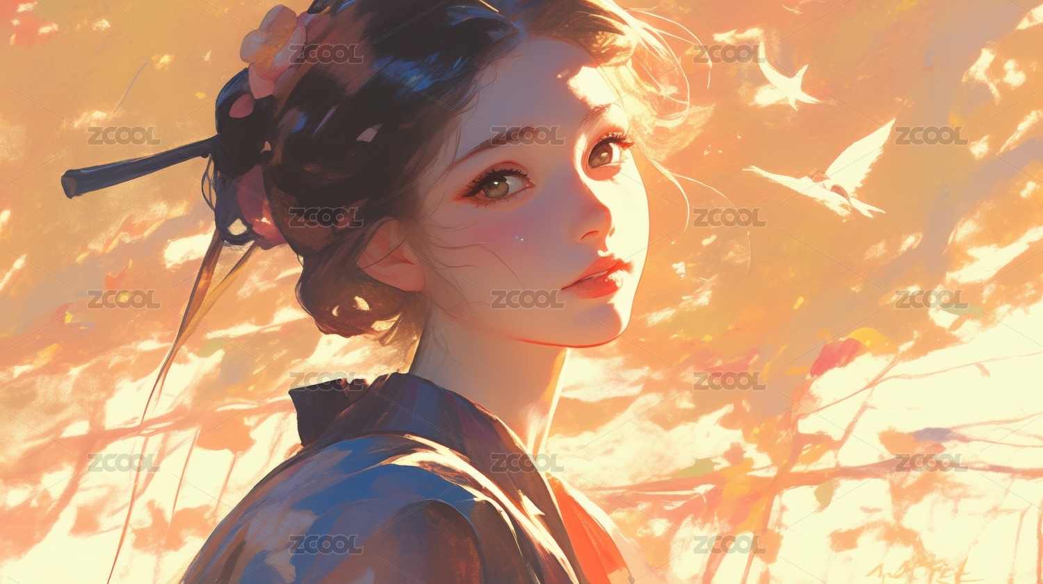 一位装饰着鲜艳花朵的女孩和飞鸟