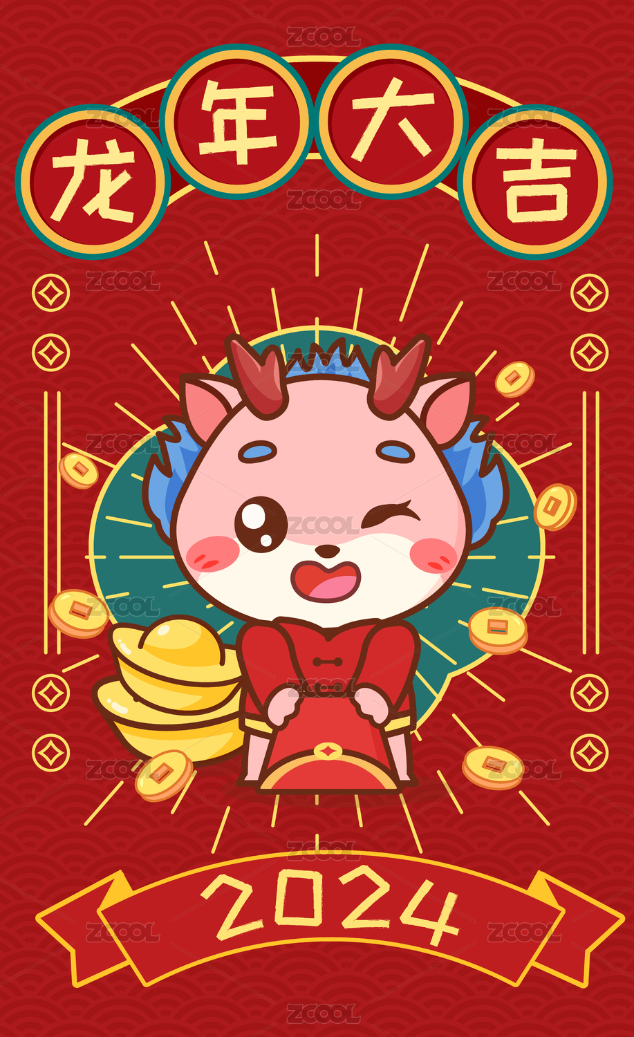 国潮,新年,春节,龙年,年画,插画,贴纸,红包,生肖,喜庆