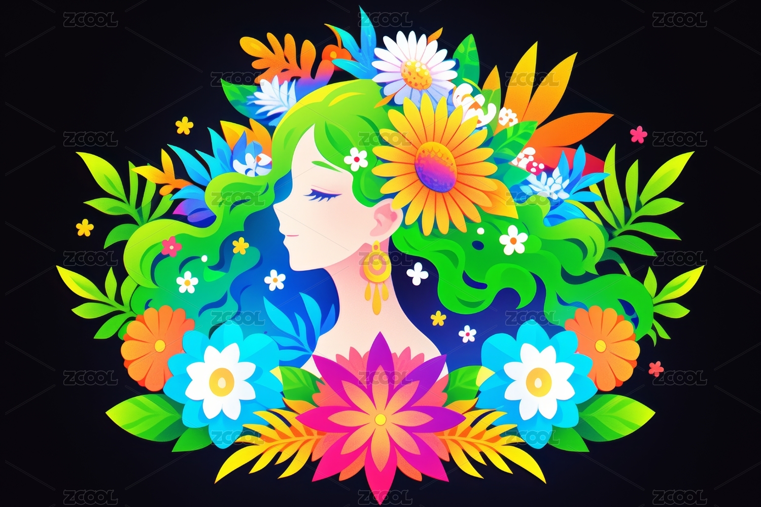 侧颜女子花卉装饰