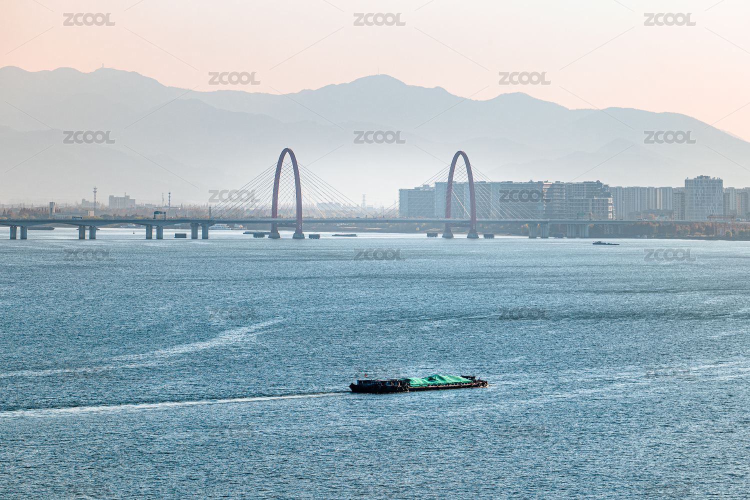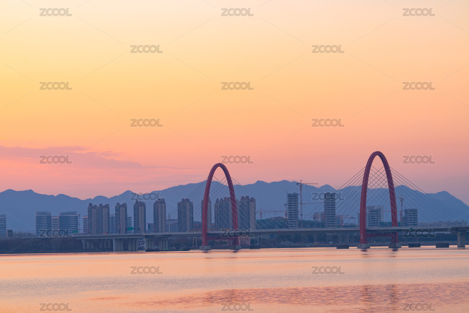 浙江省杭州富阳富春大桥富春江晨曦航拍