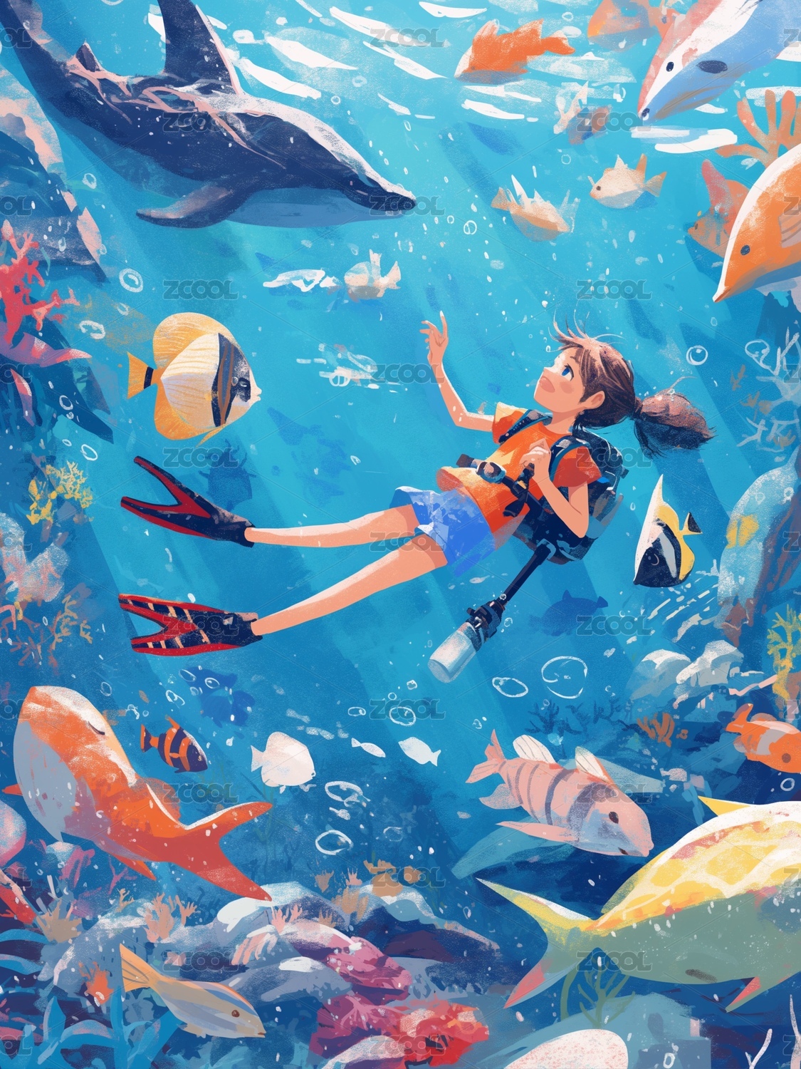 蓝色海洋中小姑娘与鲸鱼共舞海草鱼群环绕