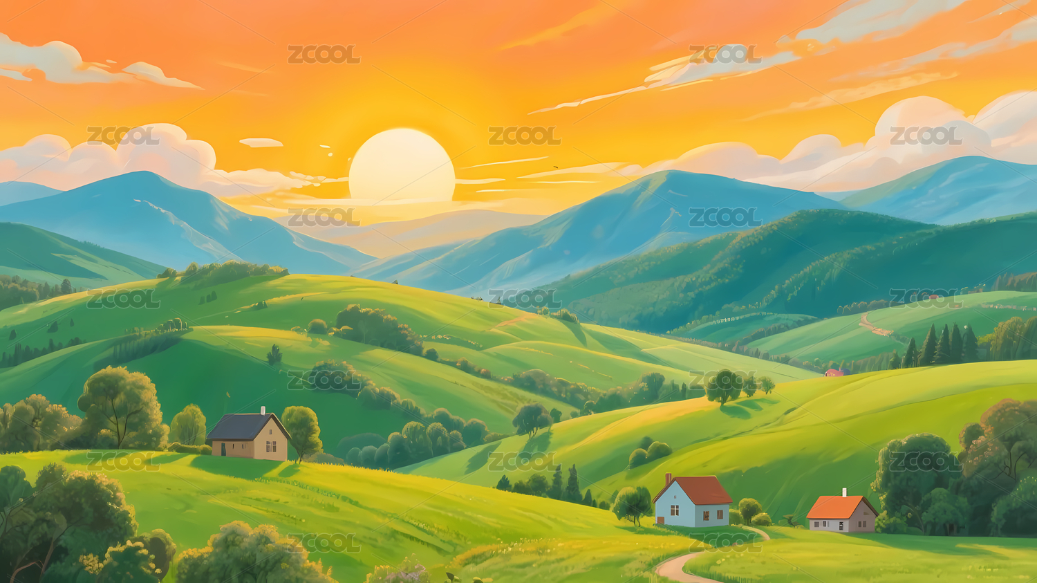 山丘,草地,房屋,树木,花朵,云朵,阳光,道路,乡村,自然