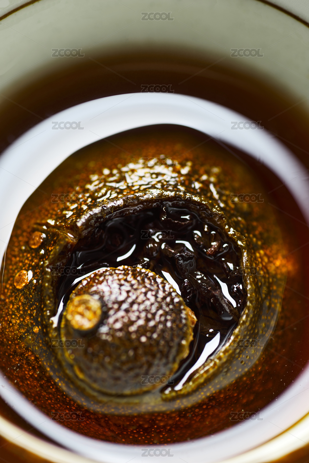 陶瓷茶器里析出茶汤的青柑普洱茶