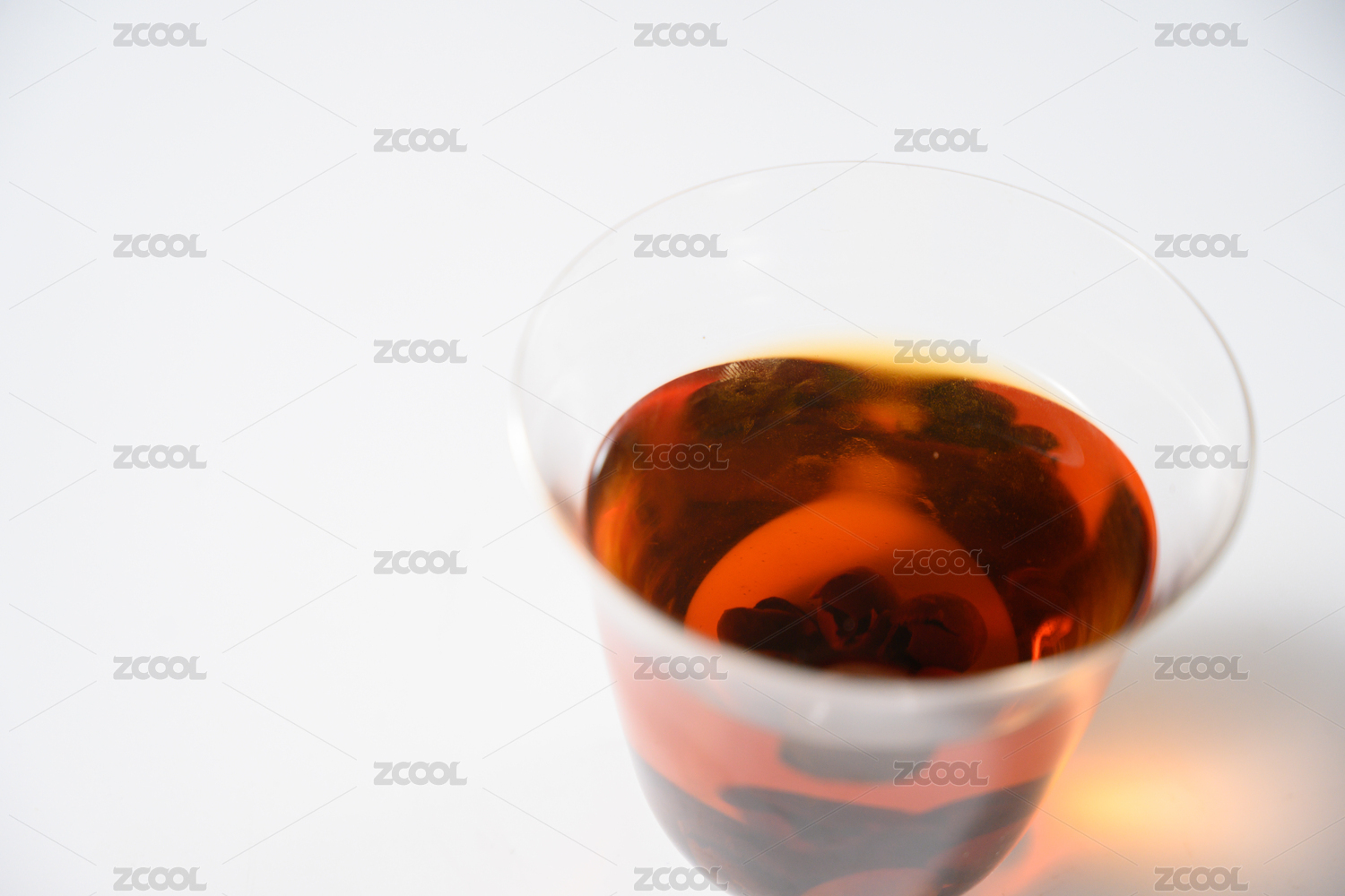 放在深色背景上的一玻璃杯红色普洱熟茶茶汤特写