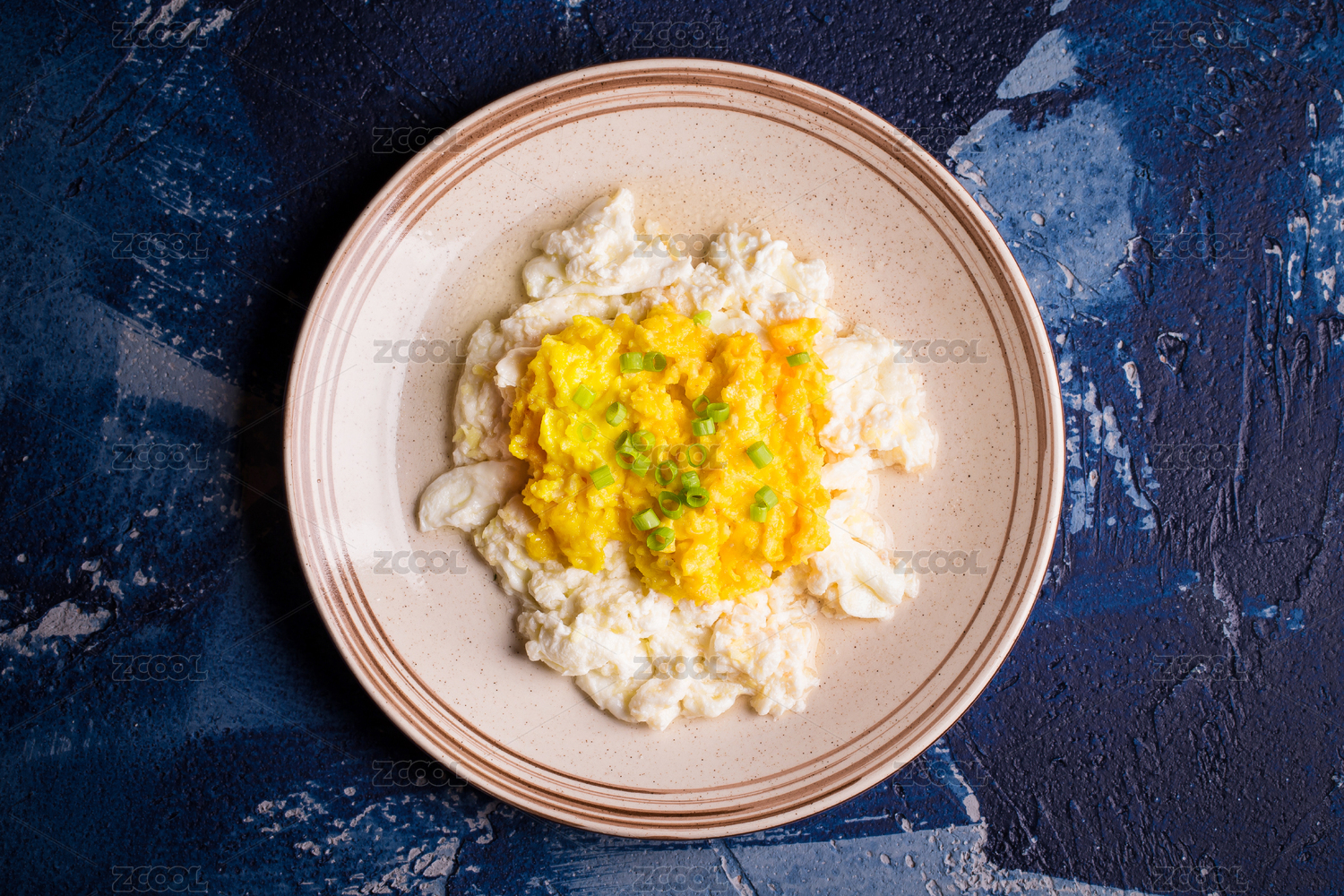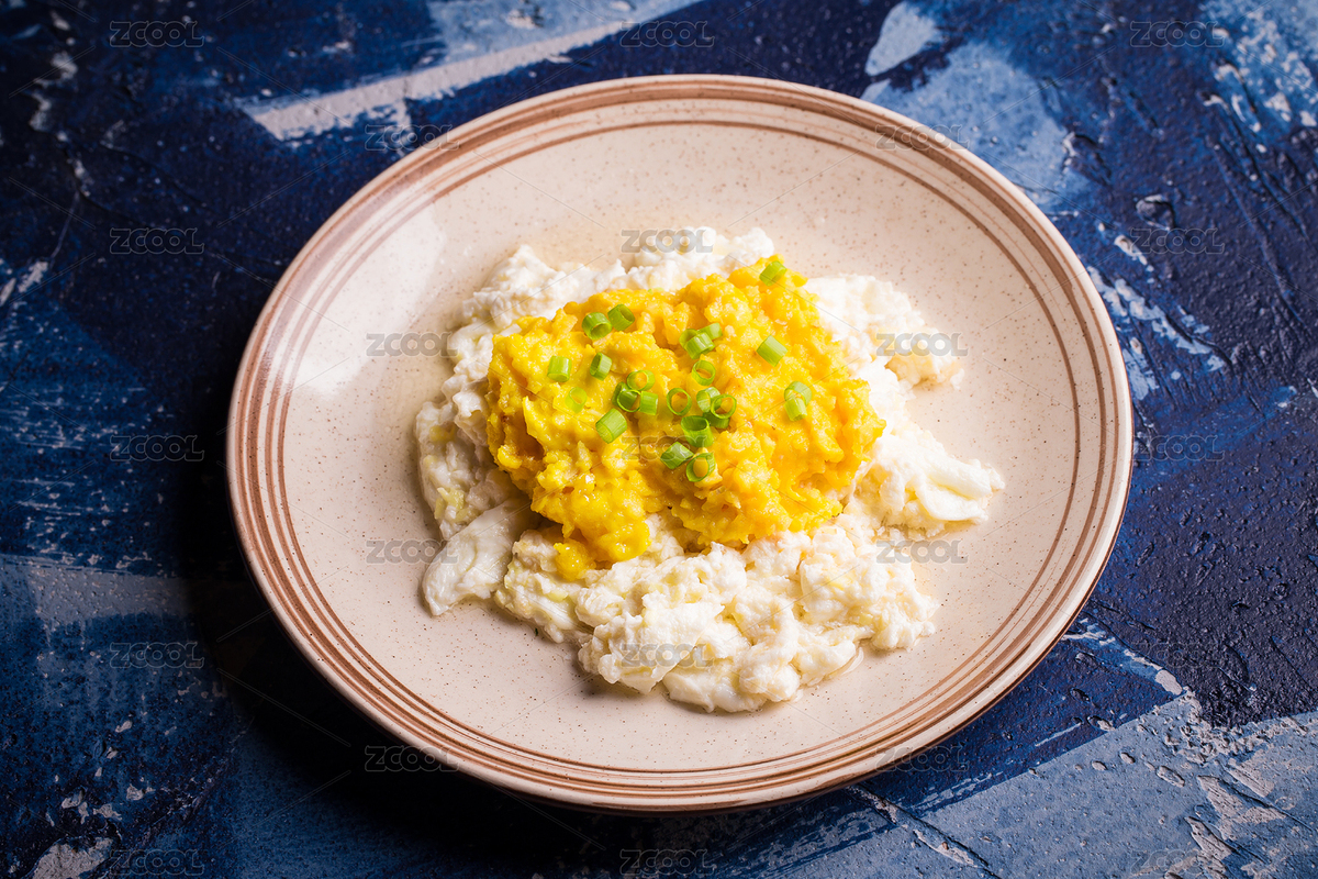 黑色背景盘子上的营养早餐美食煎鸡蛋特写