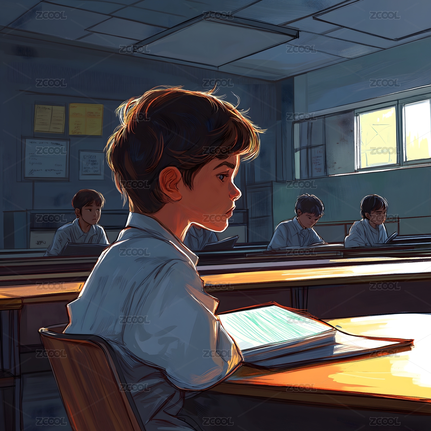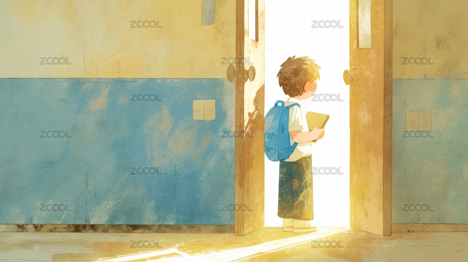 教室,逆光,窗户,光,插画,男孩,学生,小学生,中学生,背光