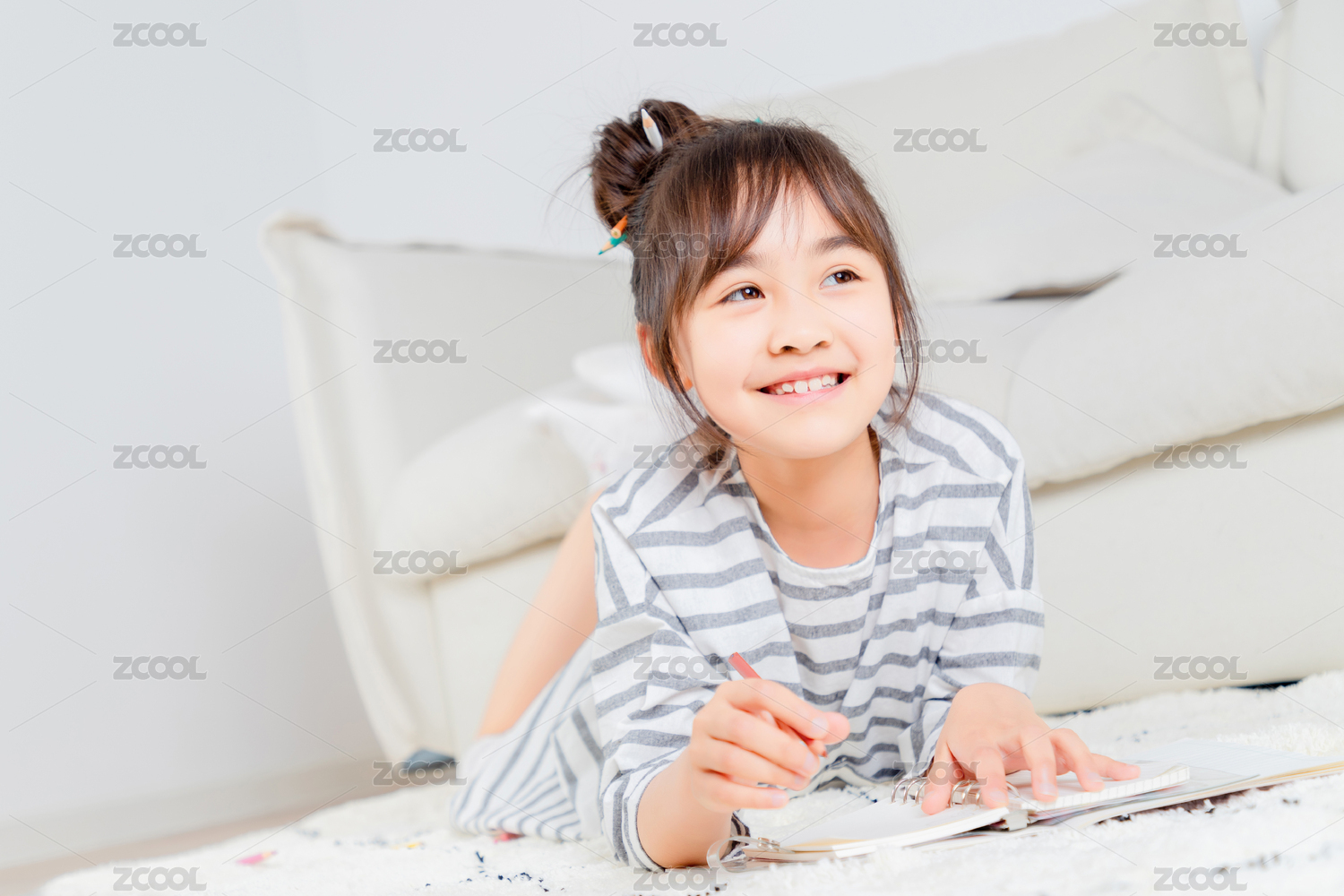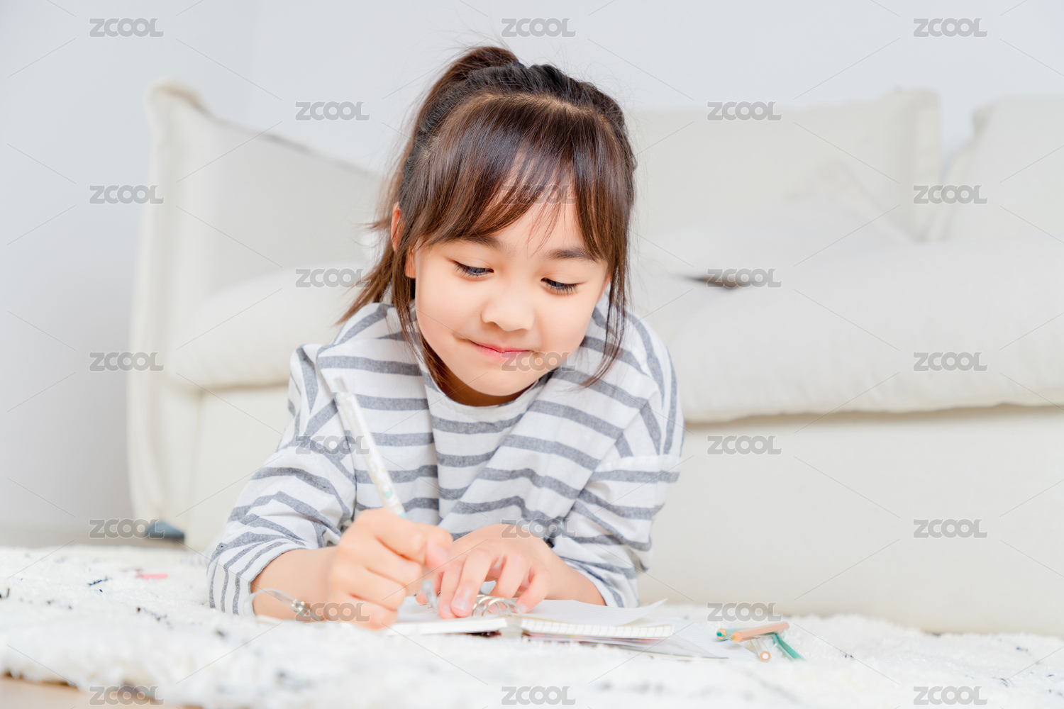趴在地毯上写字的亚洲小女孩
