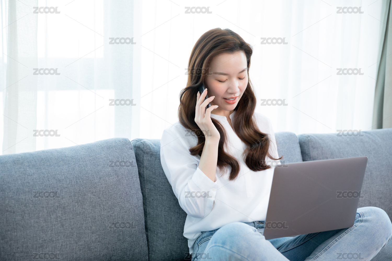 坐在沙发上的亚洲美女,正在使用电脑打字