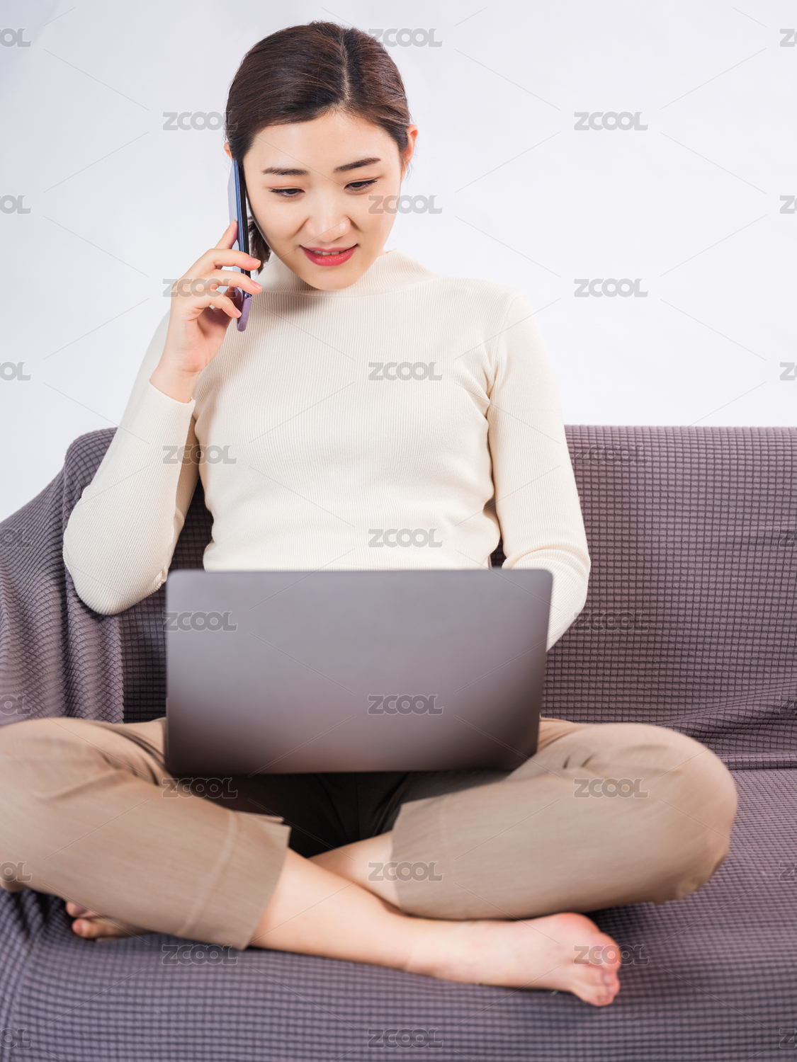 坐在沙发上一边使用电脑一边使用手机的年轻女孩