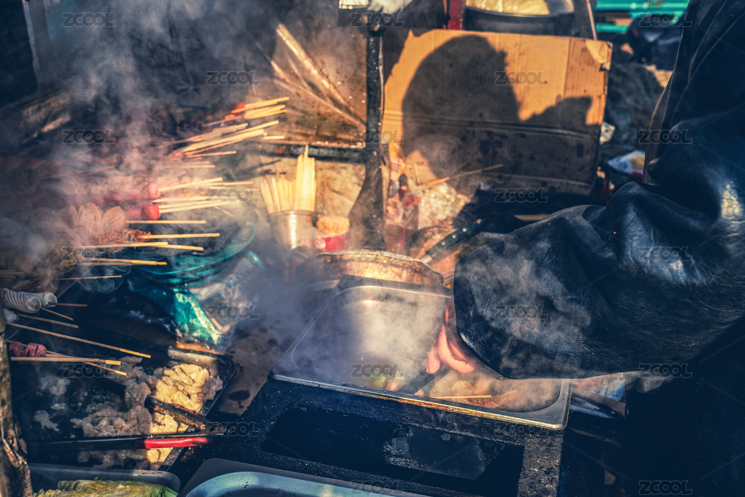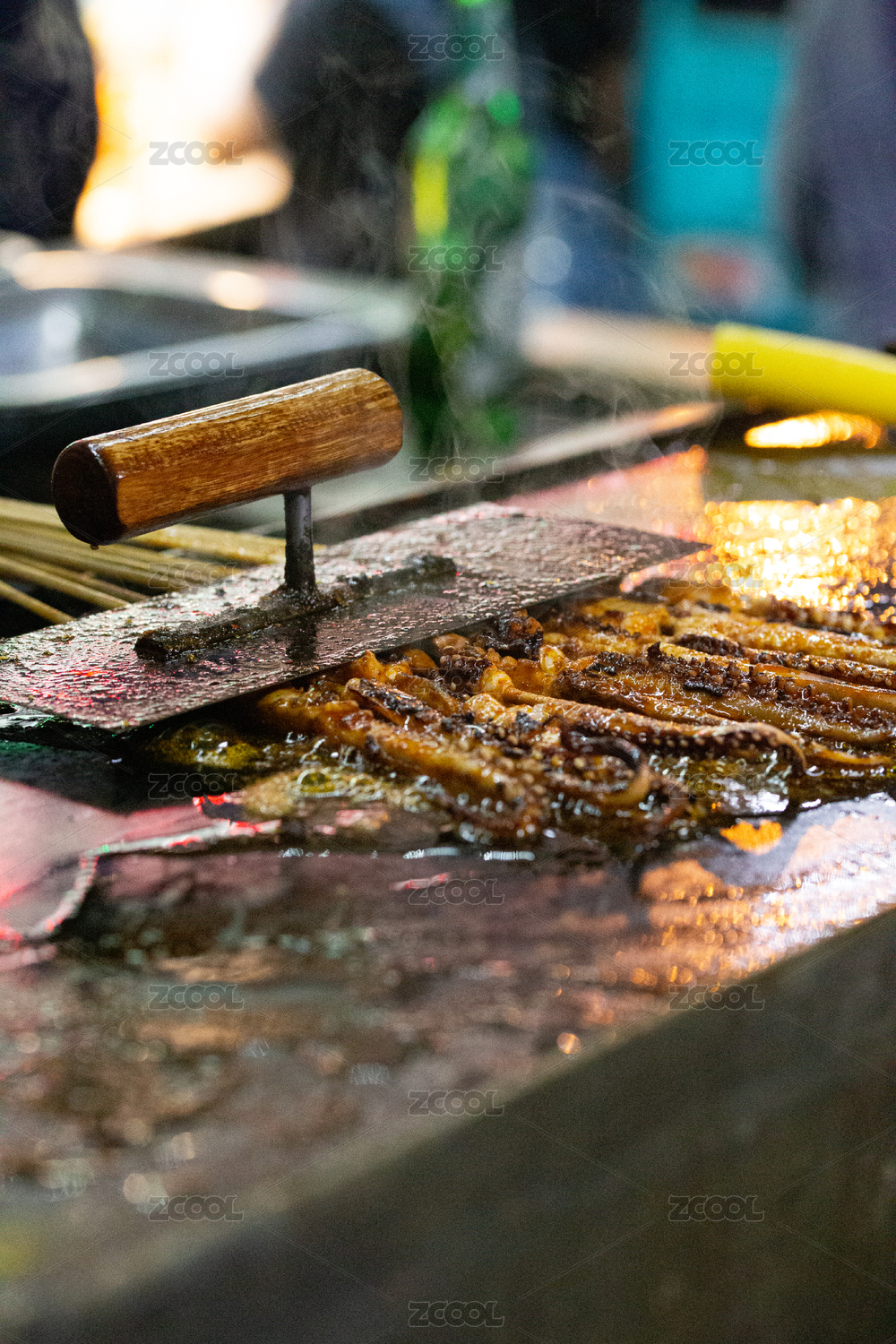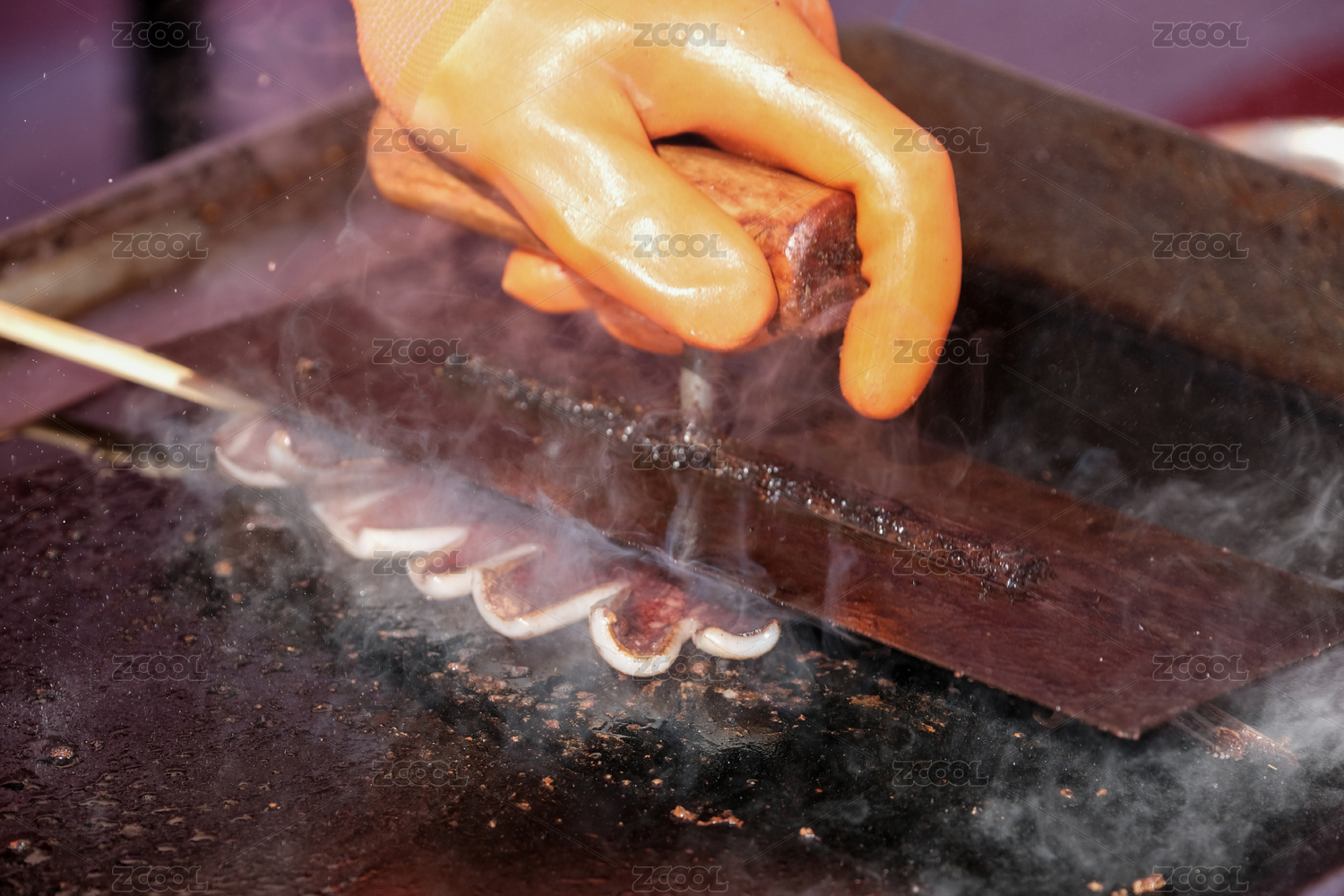 正在烤制的铁板鱿鱼铁板鱿鱼须特写