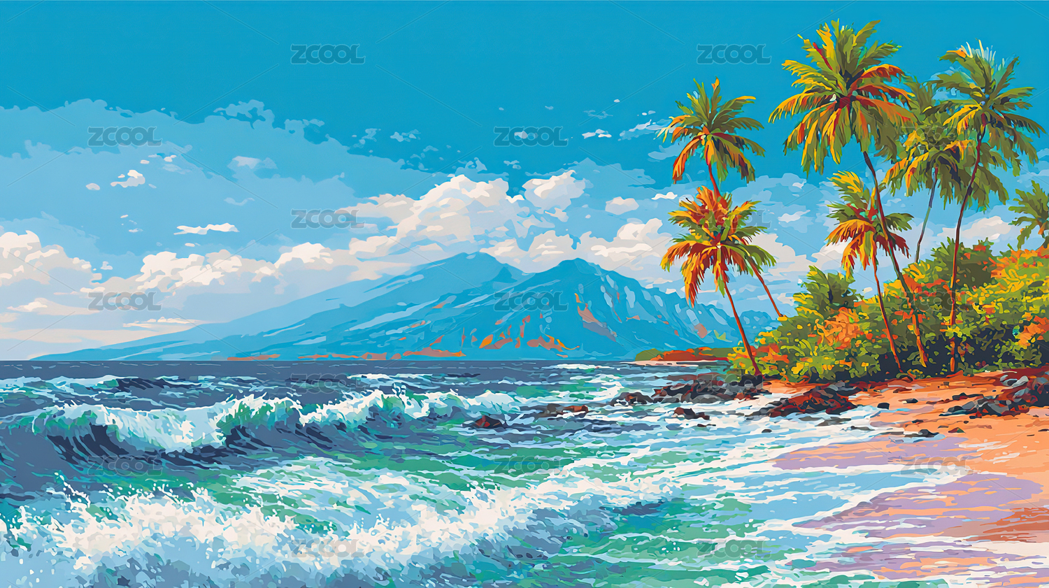 海浪椰子树风景插画