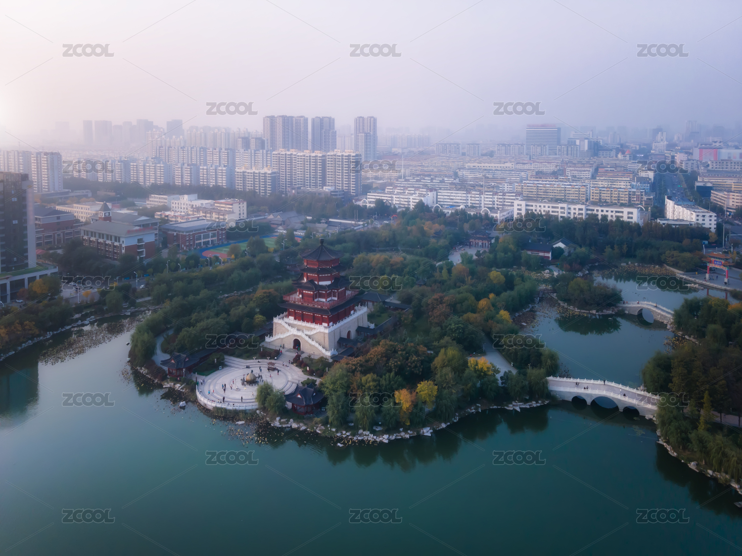 山东省济宁市太白湖旅游景区北湖阁航拍黄昏