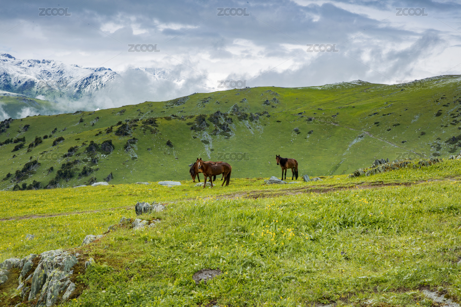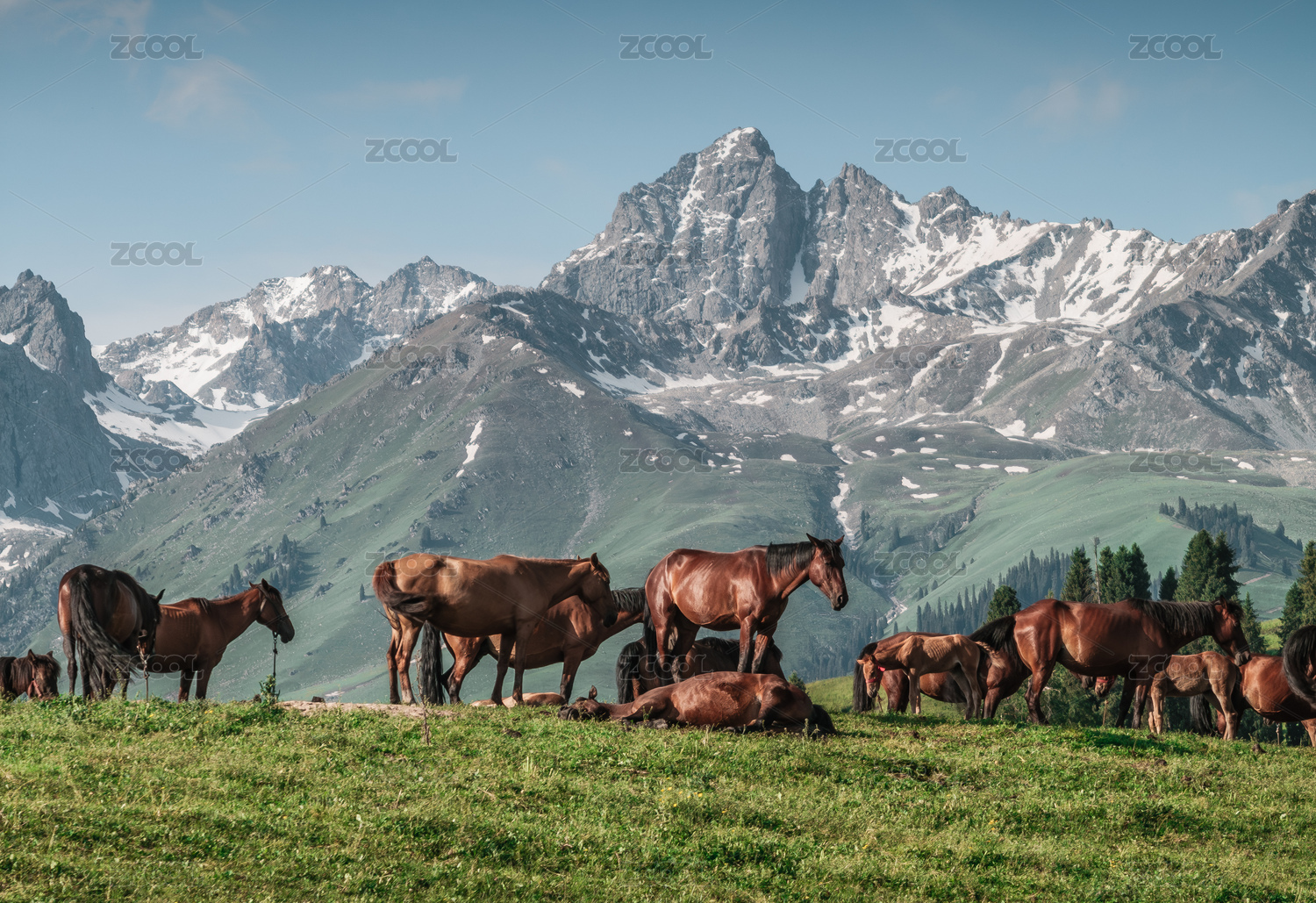 中国新疆伊犁恰西草原雪山牧场马自然风光
