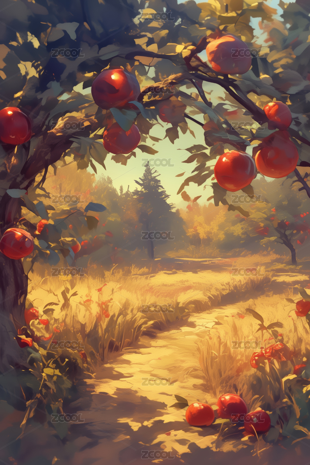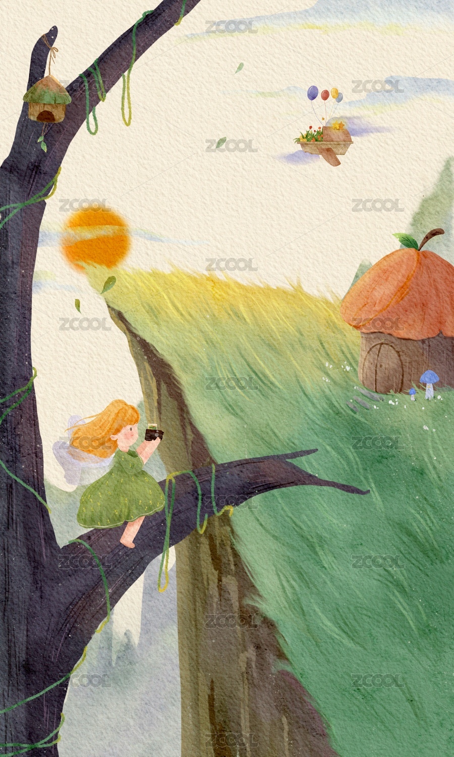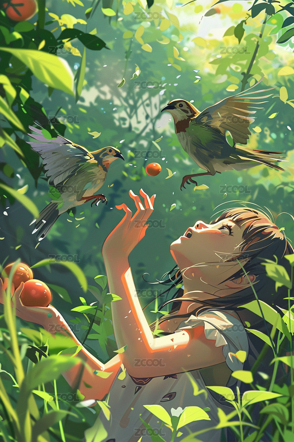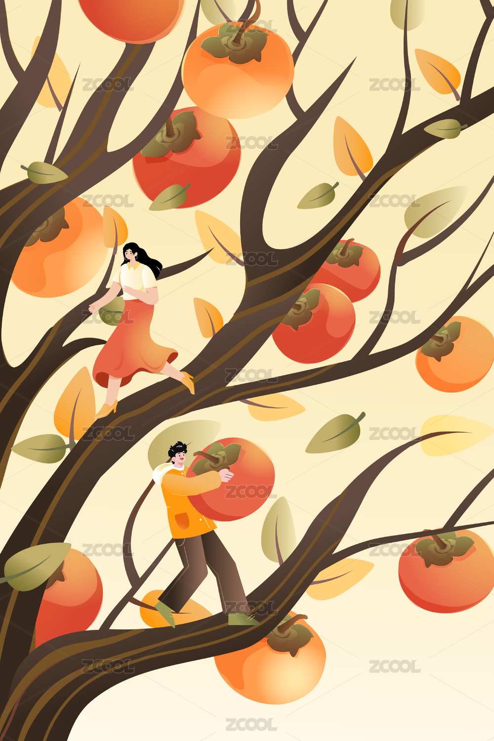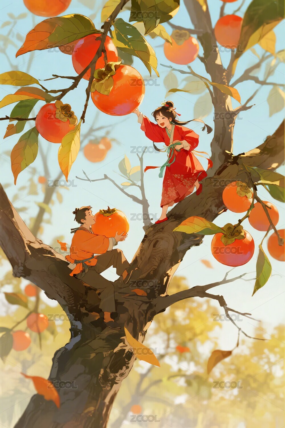 秋天的柿子树下女孩奔跑着追逐柯基小狗