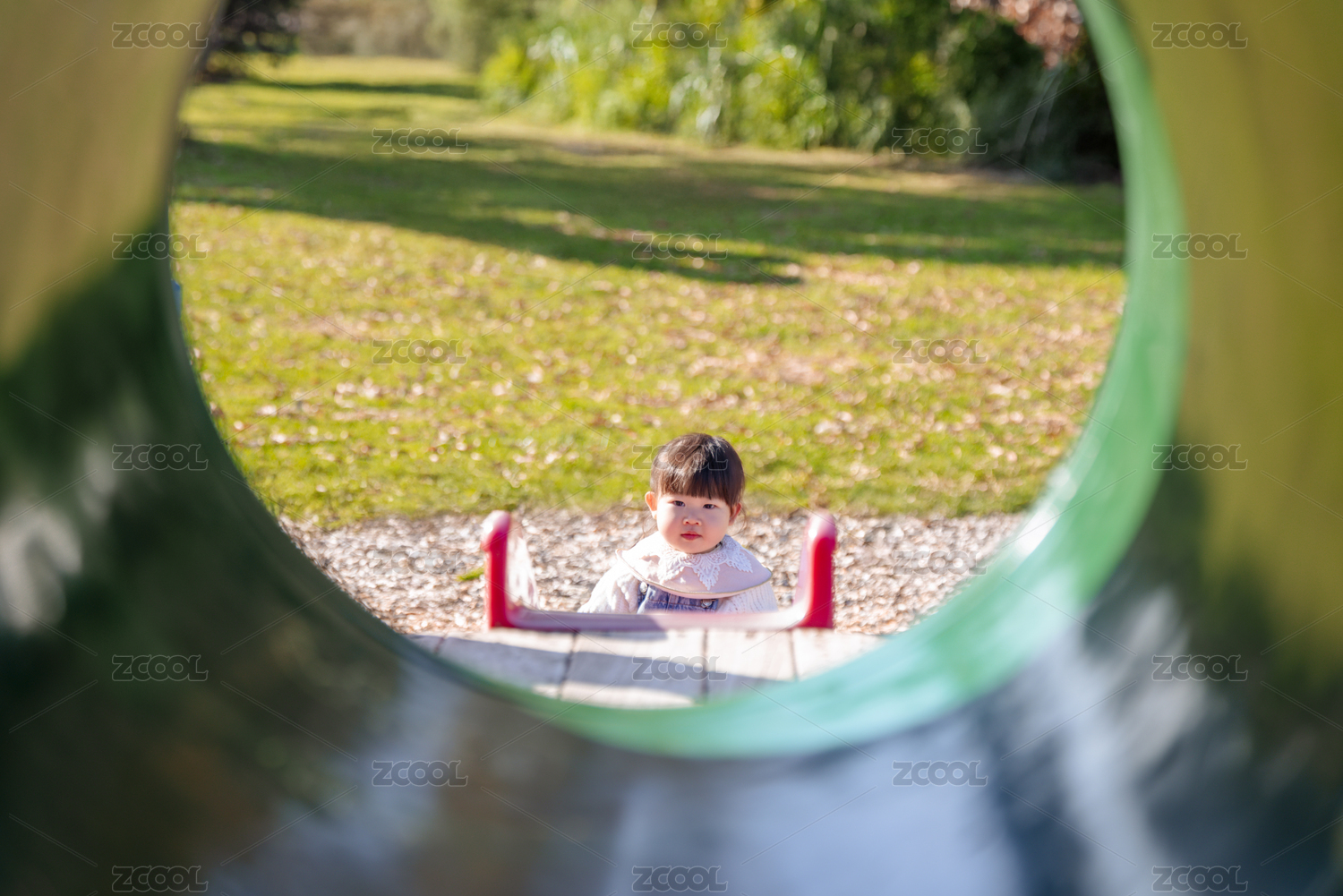游乐场圆孔滑滑梯的一岁半女孩特写