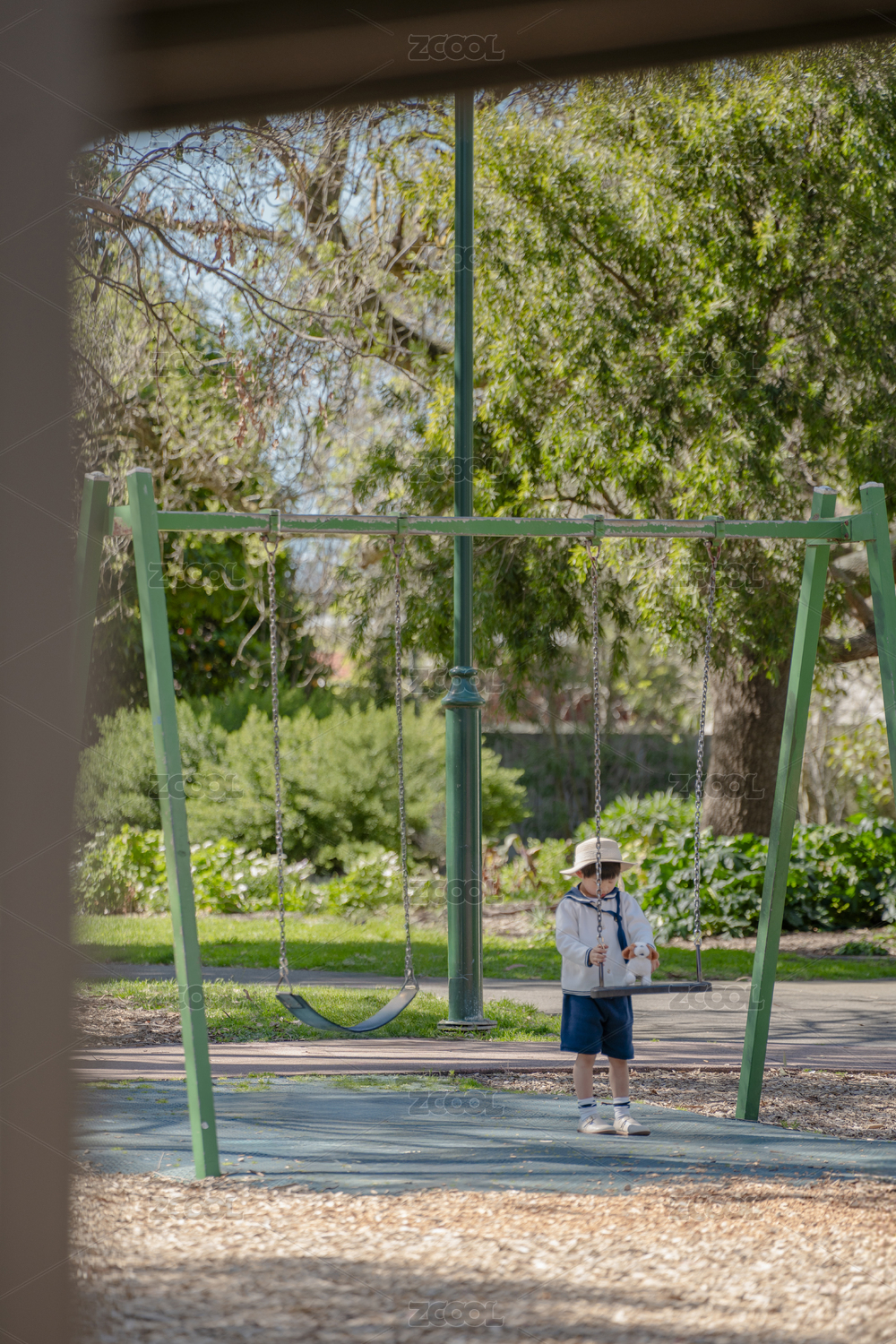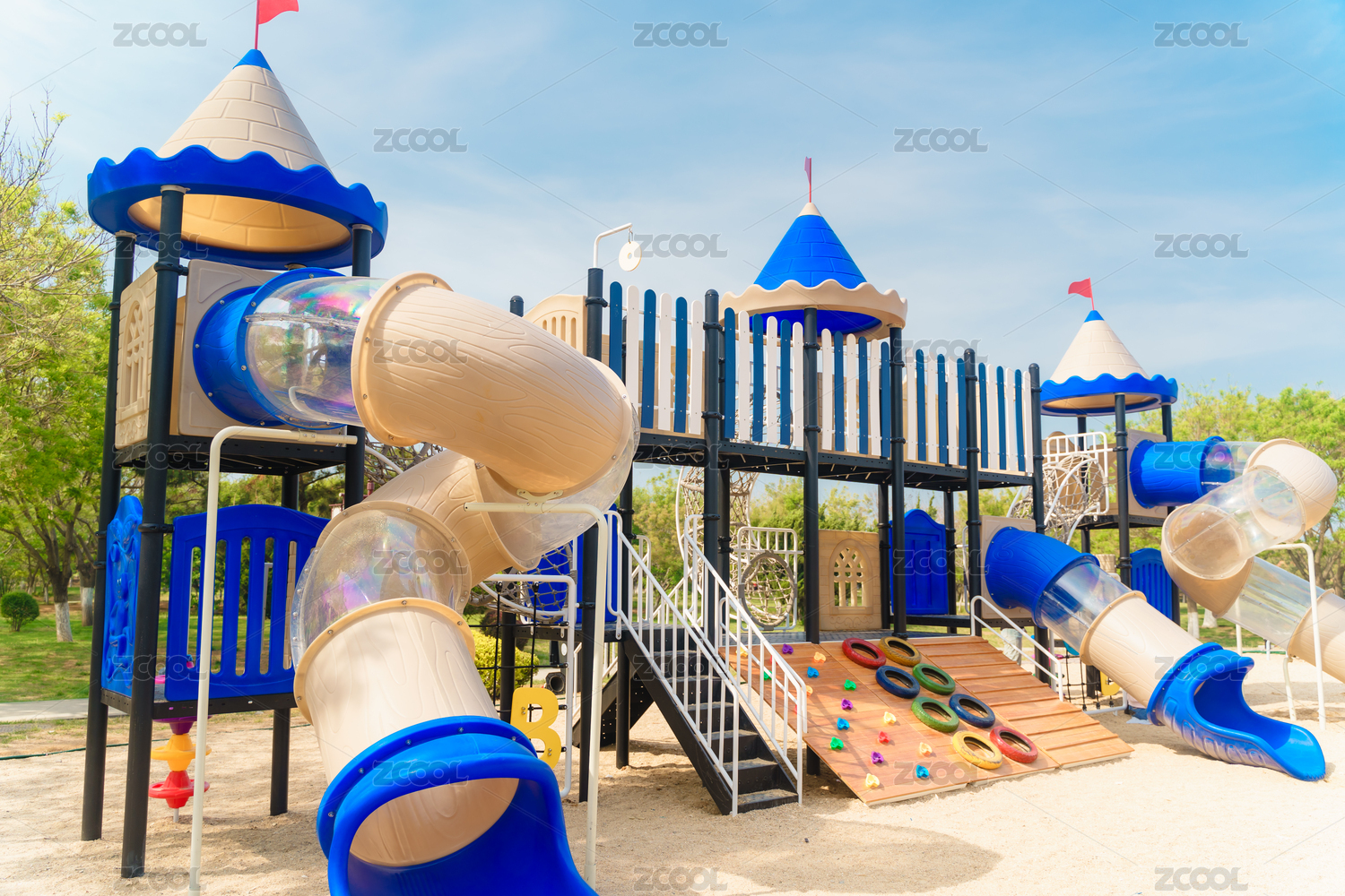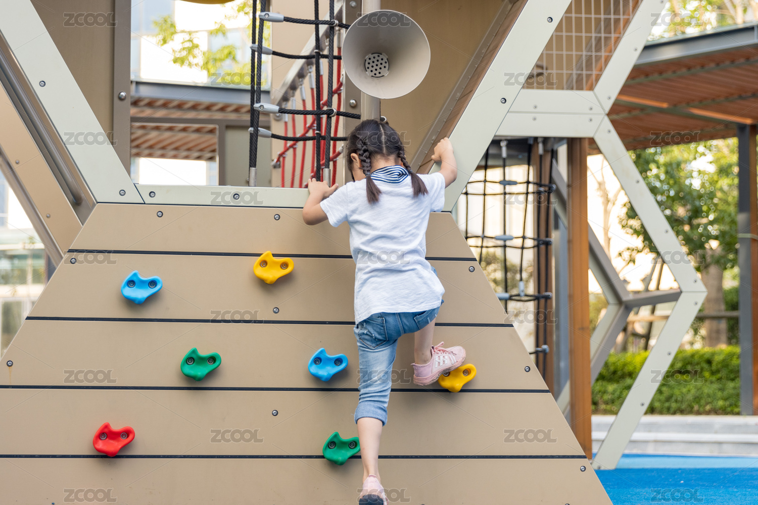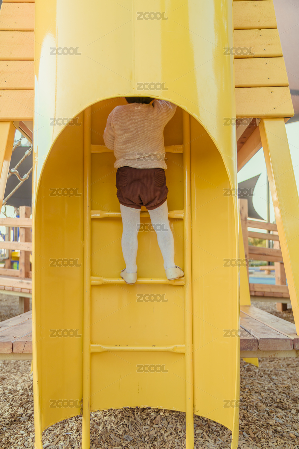 游乐场黄色铁皮桶爬逃生梯子的男孩