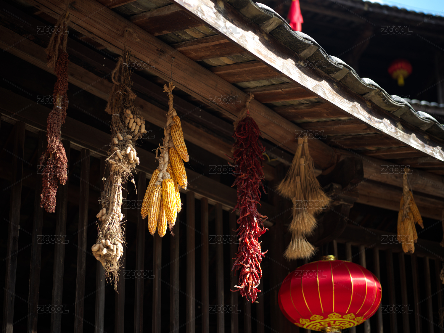 福建省龙岩市初溪土楼悬挂的玉米和辣椒