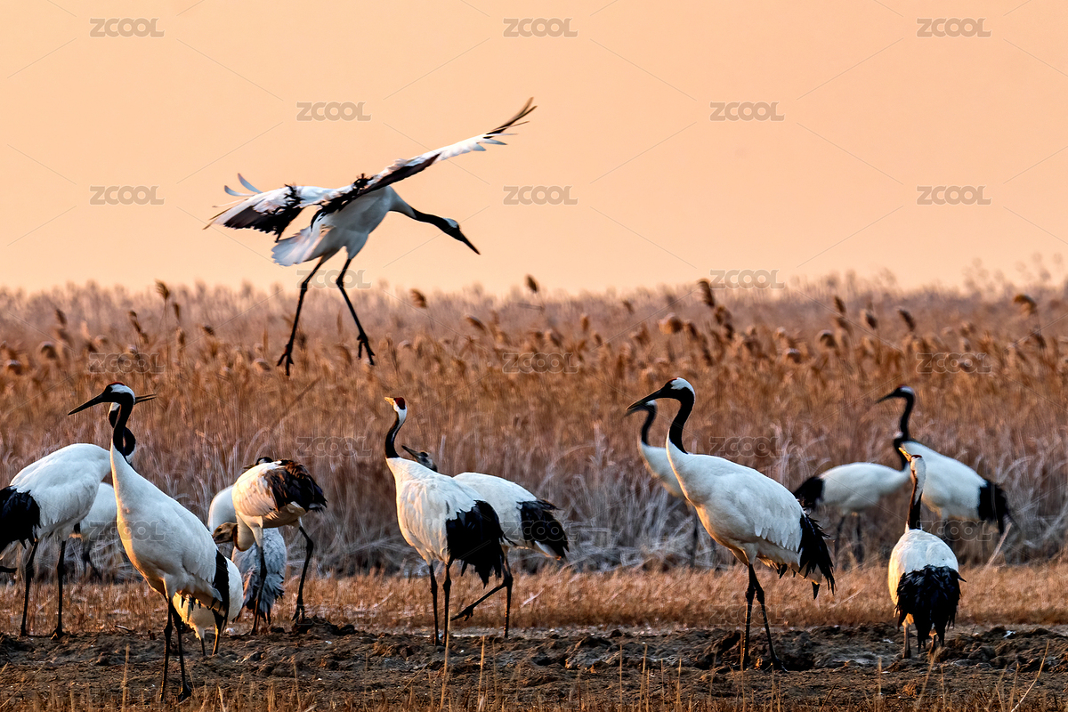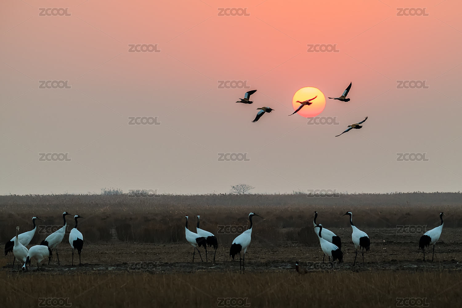 丹顶鹤,户外,黎明,少量物体,早晨,自然,风景,野外,动物,图像