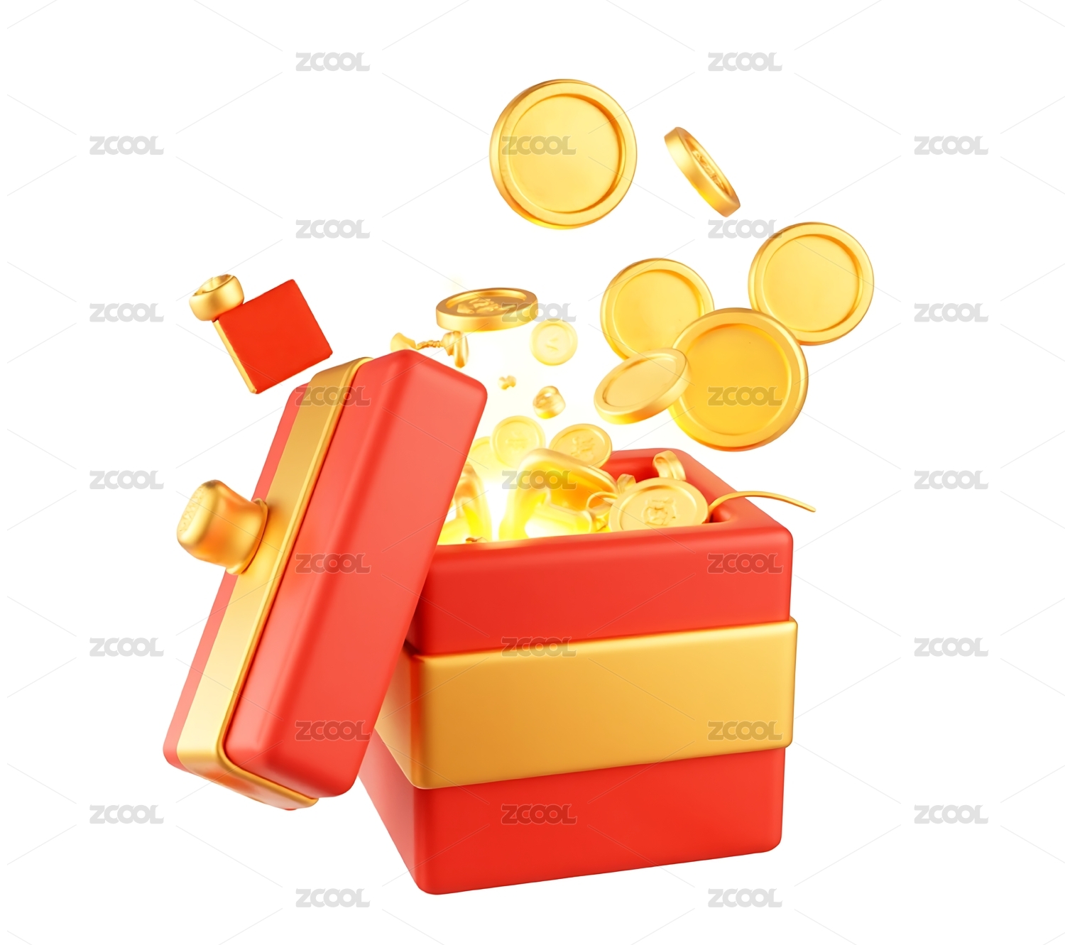 3D渲染的打开的红色礼盒红包金币优惠券礼