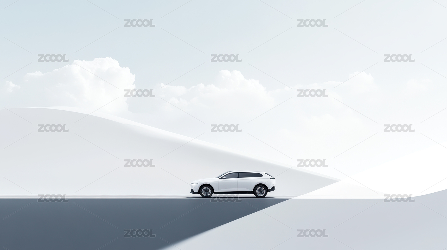 白色汽车行驶在粉色丘陵地带