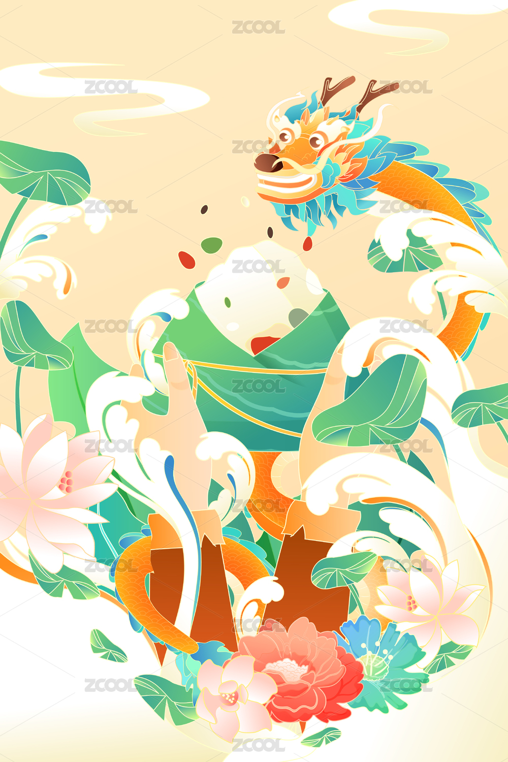 五月初五端午节快乐卡通粽子龙舟国潮插画
