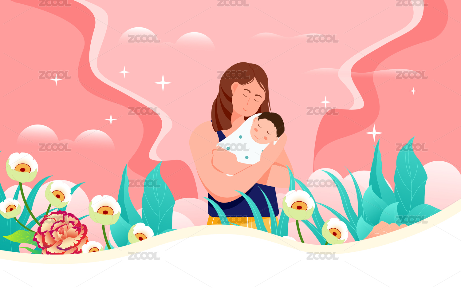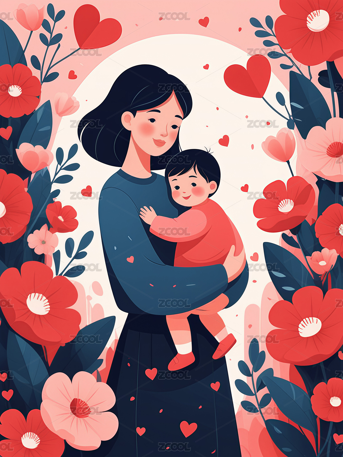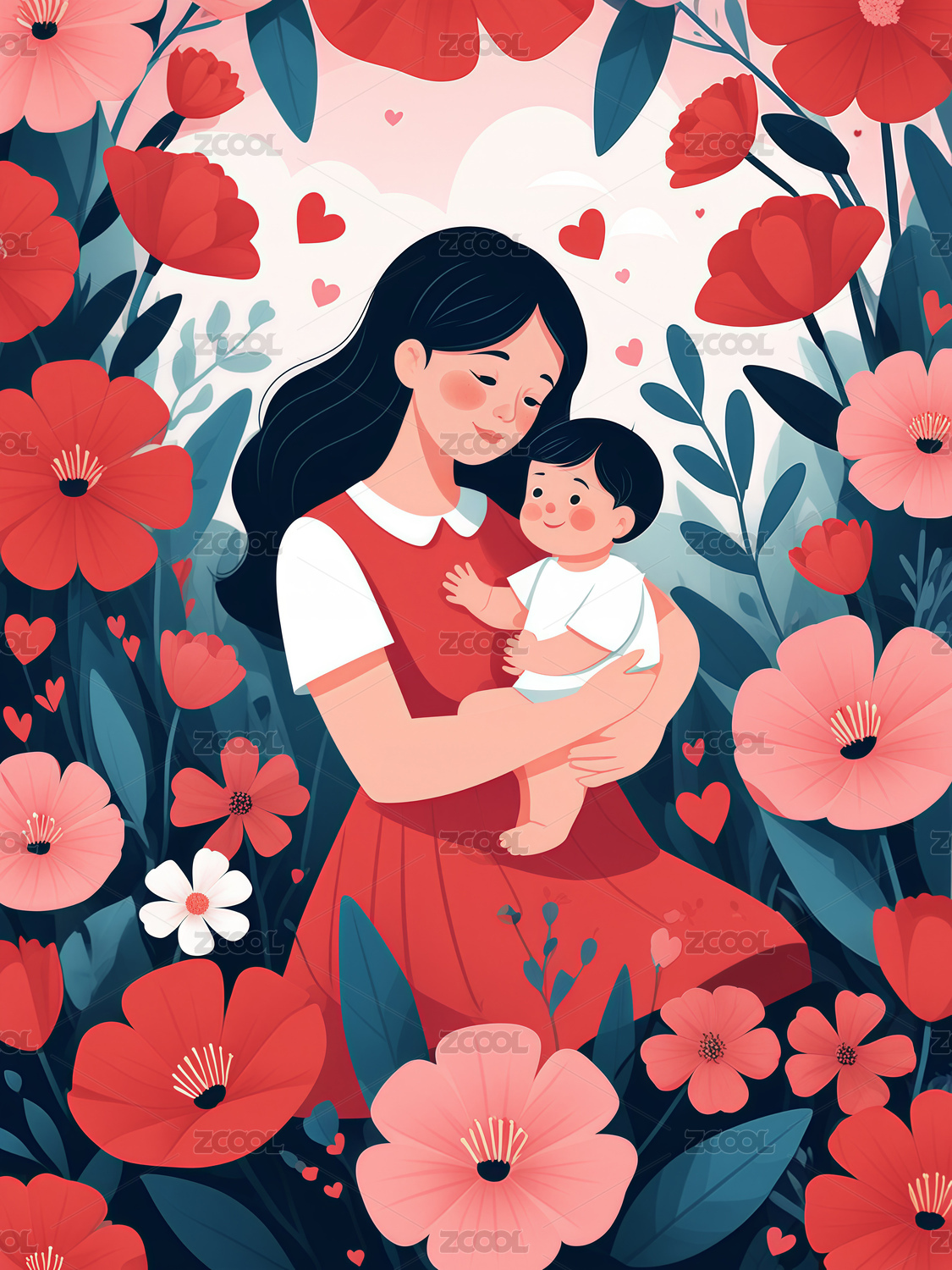 花丛中妈妈抱着孩子插画