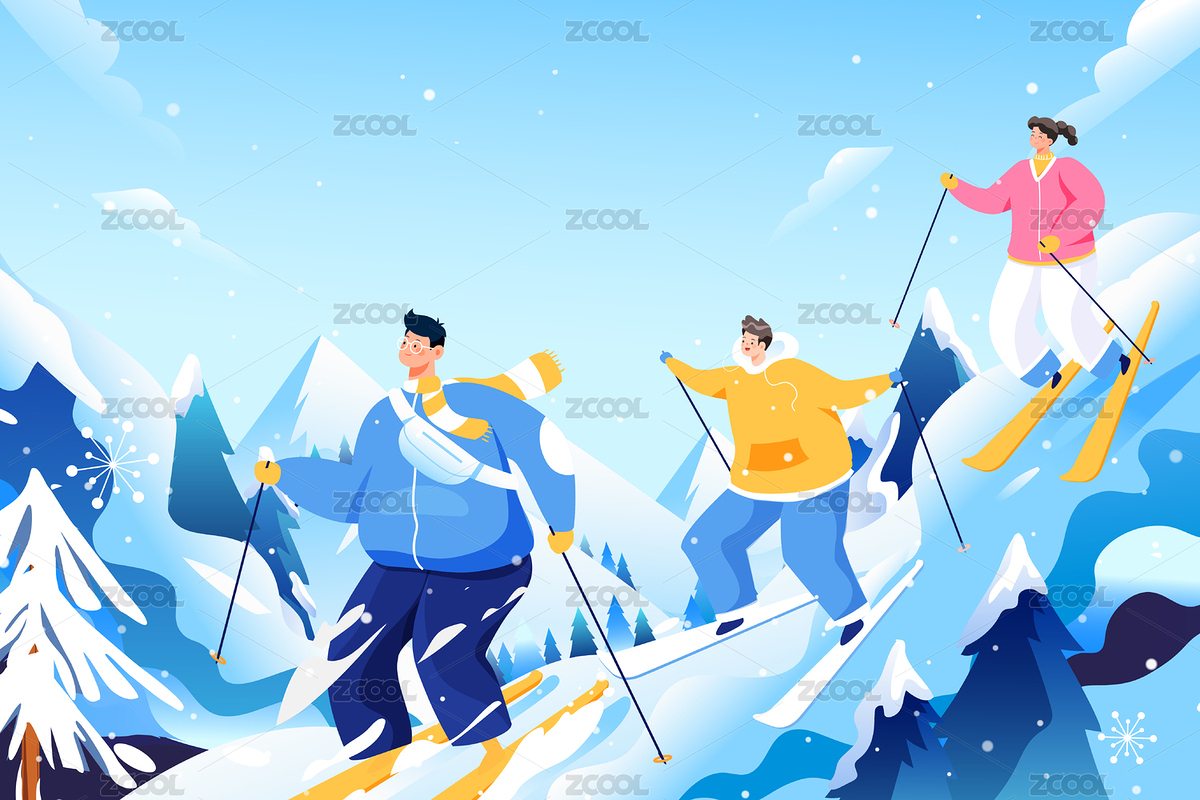 冬季滑雪运动户外出行旅游景点活动矢量插画
