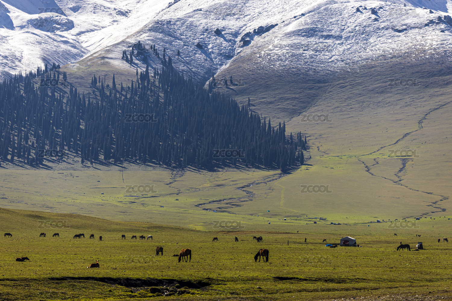 中国新疆伊犁那拉提的雪山草地森林与牧场